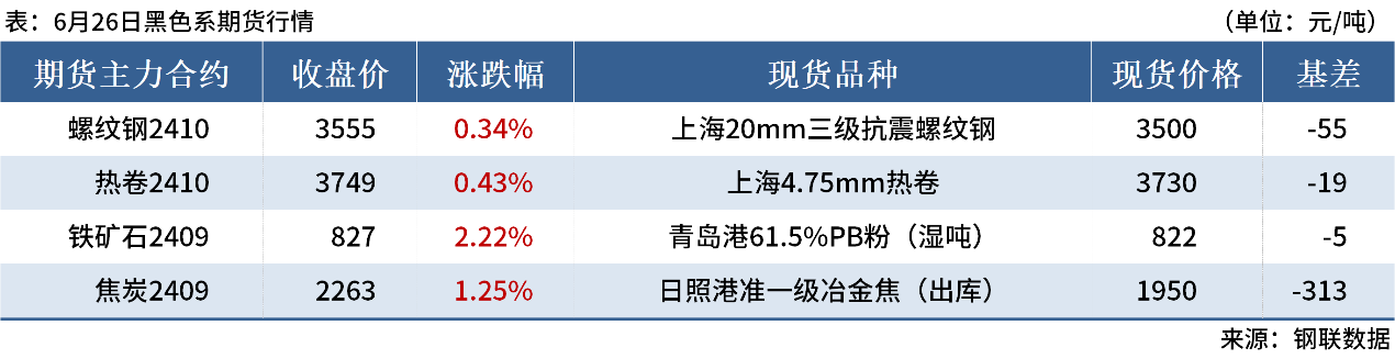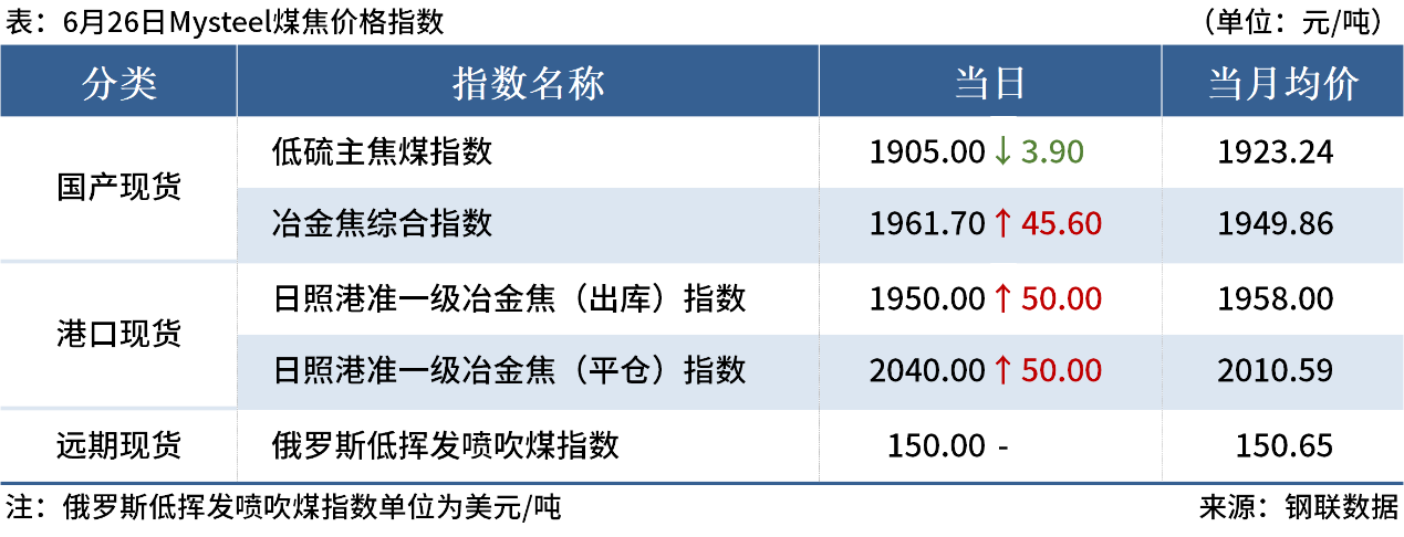 ◎6月26日,河北、山東等地主流鋼廠發(fā)函接受焦炭提漲,漲幅為50-55元/噸,焦炭首輪提漲落地。