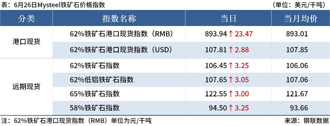 ◎6月26日,Mysteel 62%鐵礦石指數(shù)106.45, 漲3.25,月均106.06;65%鐵礦石指數(shù)122.55, 漲3,月均121.67。(單位:美元/干噸)