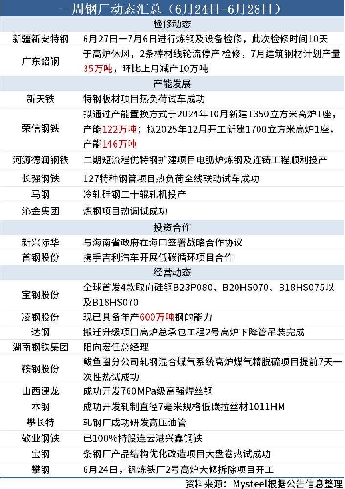 據(jù)Mysteel不完全統(tǒng)計(jì),本周(6月24日-6月28日)有2家鋼廠發(fā)布檢修信息,具體如下: