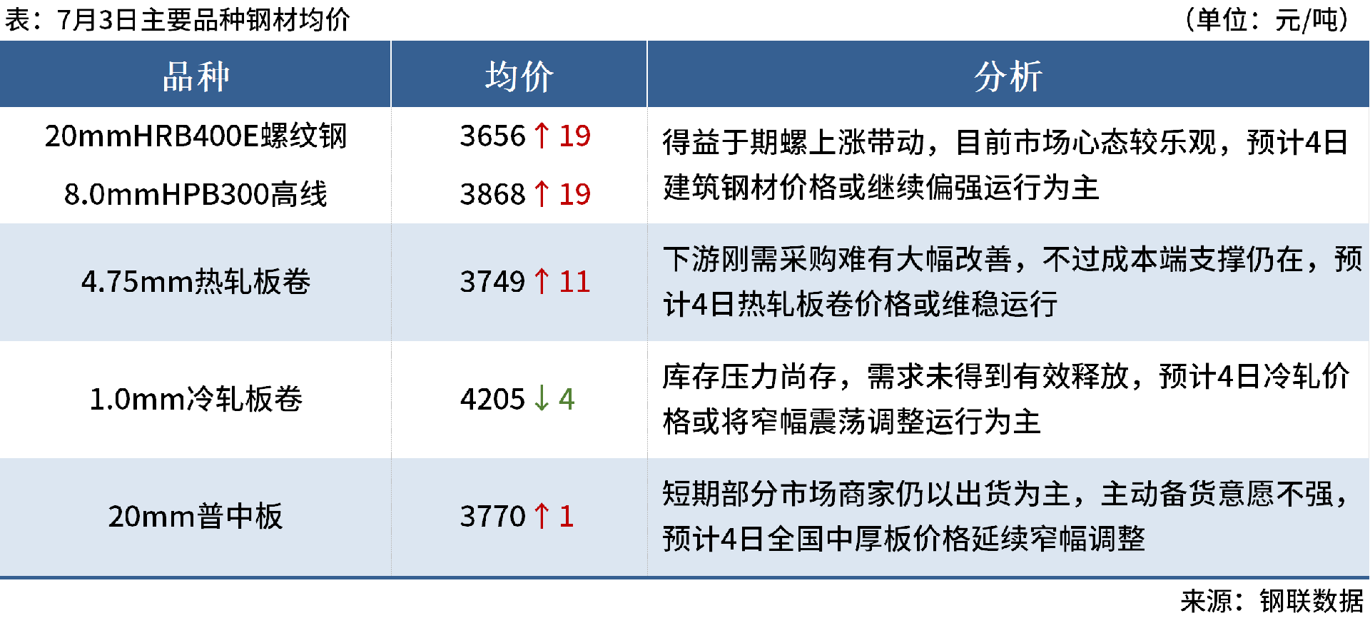 ◎7月3日,5家鋼廠上調(diào)建筑鋼材出廠價(jià)10-20元/噸。