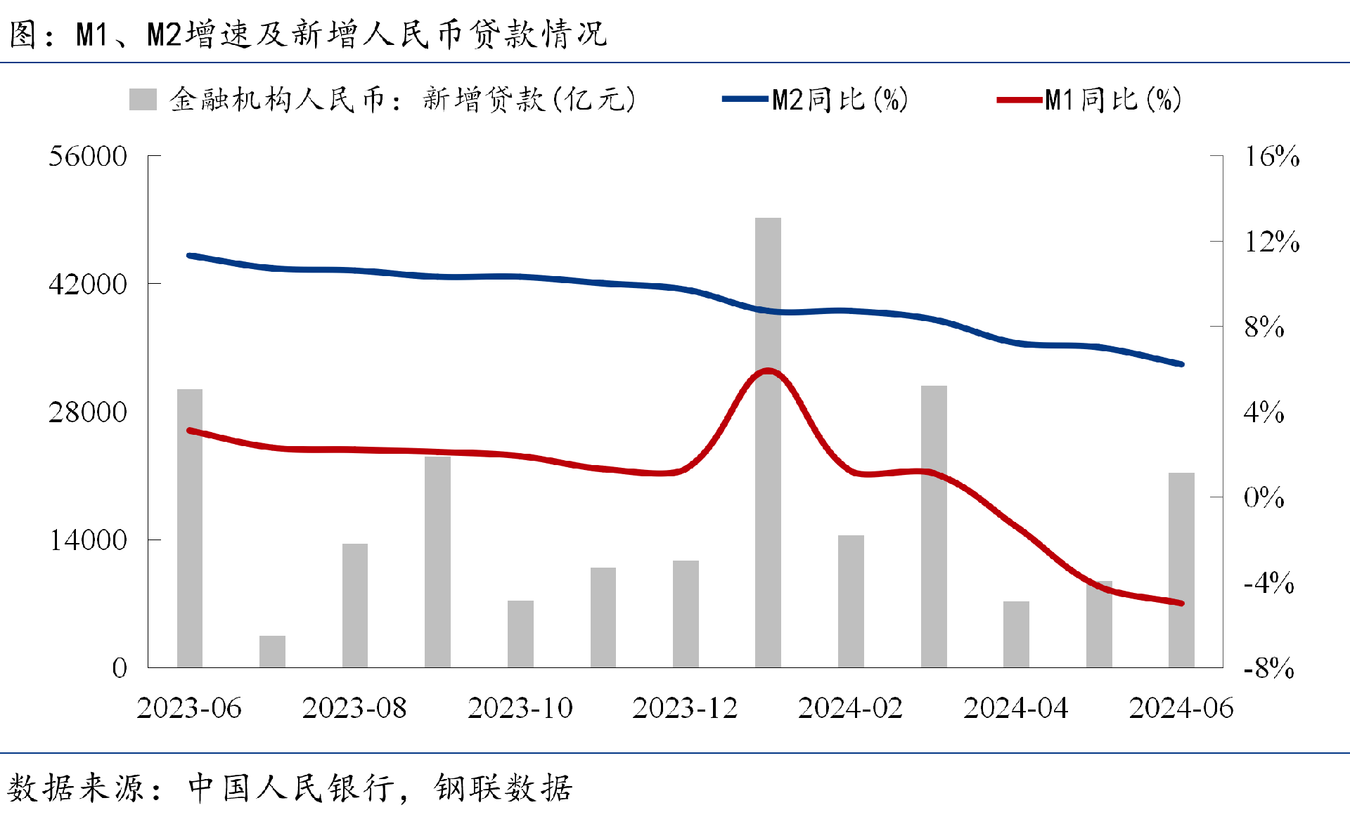 ◎ 中國人民銀行發(fā)布的6月金融數(shù)據(jù)顯示,2024年上半年社會融資規(guī)模增量累計為18.1萬億元,比上年同期少3.45萬億元。其中,對實體經(jīng)濟發(fā)放的人民幣貸款增加12.46萬億元,同比少增3.15萬億元。具體到6月,社會融資規(guī)模增量為3.3萬億元,同比減少9283億元,環(huán)比增加1.23萬億元;人民幣貸款增加2.13萬億元,同比少增9200億元,環(huán)比多增1.18萬億元。6月末,M2同比增長6.2%,增速比上月末低0.8個百分點;M1同比下降5%,增速仍然為負,上個月為同比下降4.2%;M1、M2增速繼續(xù)回落。