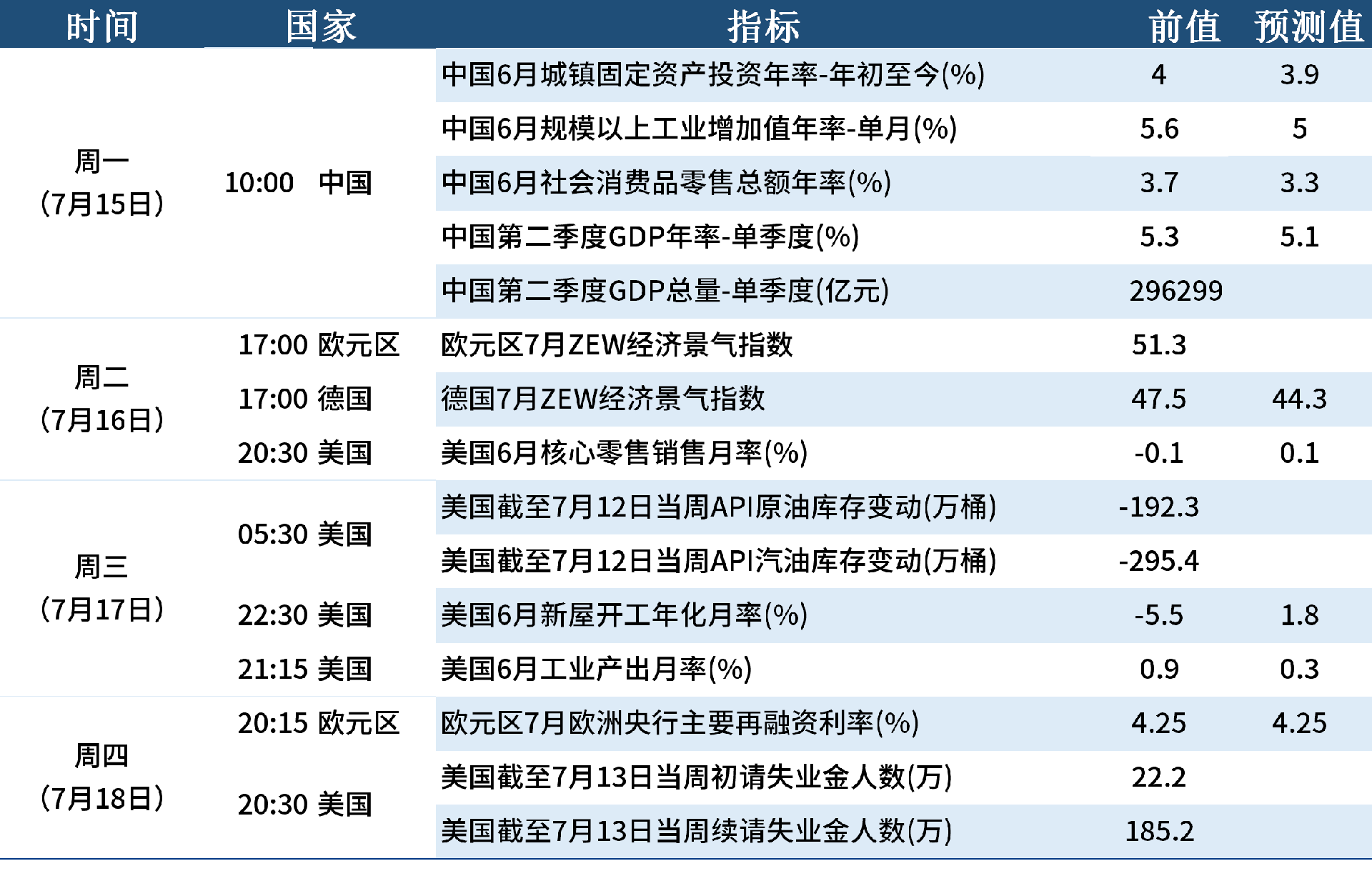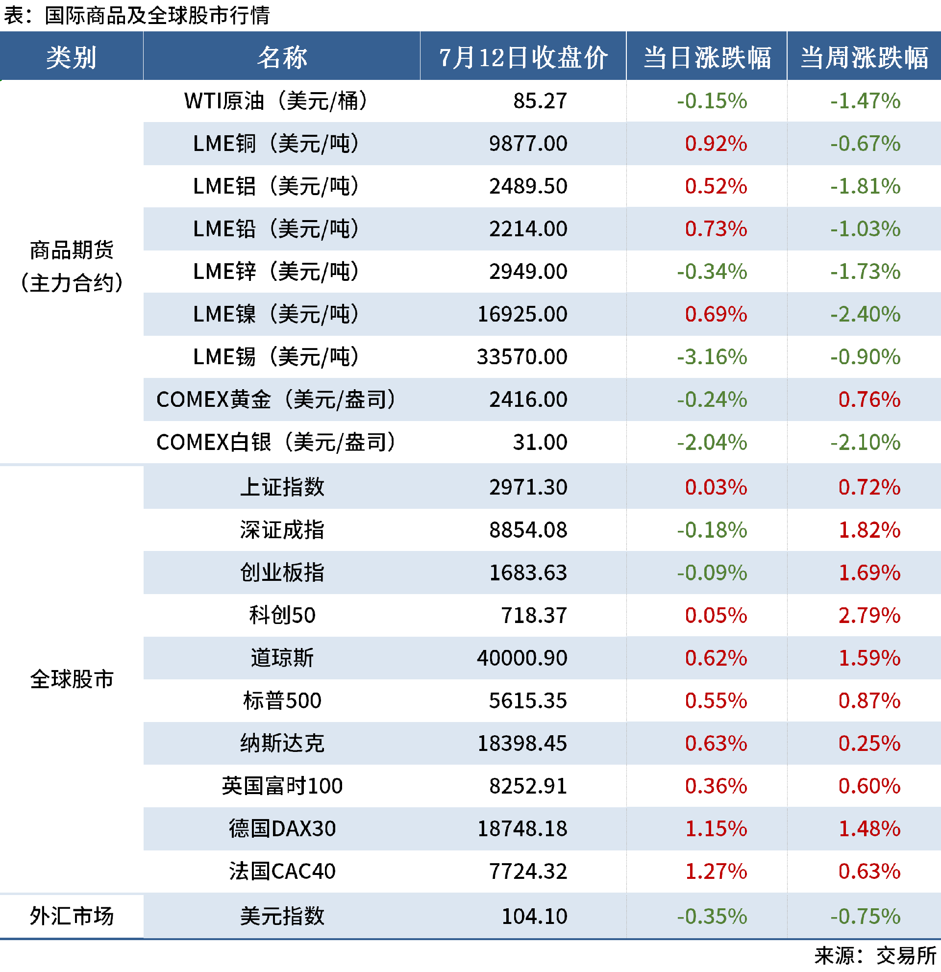 宏觀資訊:工信部部長表示要進一步擴大制造業(yè)有效投資;人民銀行將視情況開展臨時正回購或臨時逆回購操作;上半年我國外貿(mào)進出口規(guī)模創(chuàng)歷史同期新高;6月中國CPI同比上漲0.2%,PPI同比下降0.8%;6月M1、M2增速繼續(xù)回落。美國當周初請失業(yè)金人數(shù)22.2萬人,降幅大于預期。