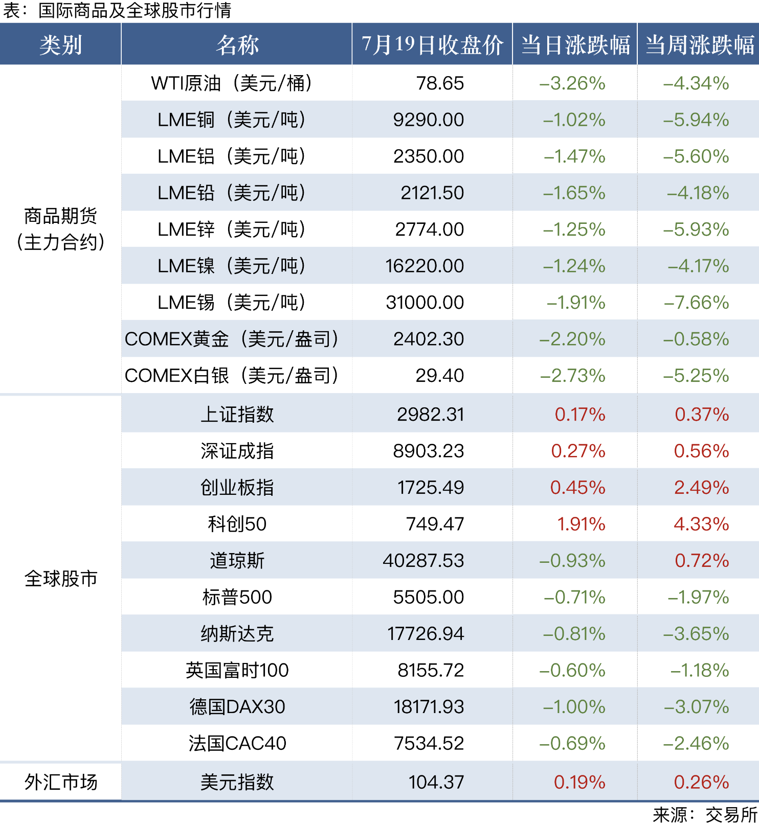 宏觀資訊:中國(guó)共產(chǎn)黨第二十屆中央委員會(huì)發(fā)布第三次全體會(huì)議公報(bào);《中共中央關(guān)于進(jìn)一步全面深化改革、推進(jìn)中國(guó)式現(xiàn)代化的決定》審議通過,共提出300多項(xiàng)重要改革舉措;2024年上半年,我國(guó)國(guó)內(nèi)生產(chǎn)總值616836億元,同比增長(zhǎng)5.0%;國(guó)常會(huì)再部署大規(guī)模設(shè)備更新和消費(fèi)品以舊換新;多家鋼廠發(fā)布鋼筋產(chǎn)品標(biāo)準(zhǔn)變更通知,并公開執(zhí)行時(shí)間;美國(guó)當(dāng)周初請(qǐng)失業(yè)金人數(shù)為24.3萬人,高于預(yù)期的23萬人。