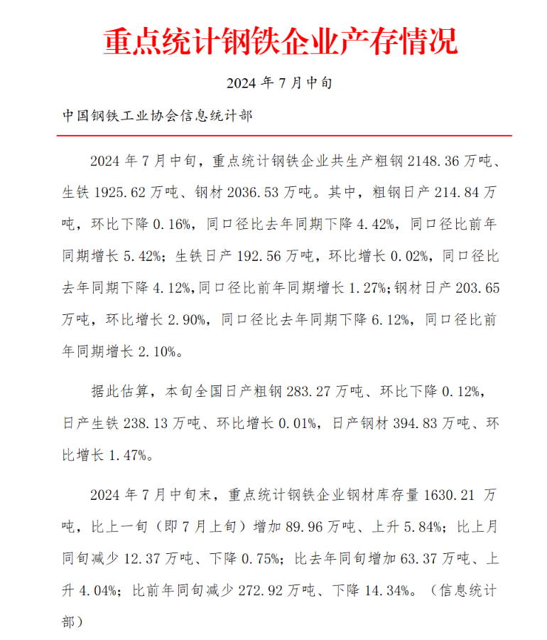 據(jù)中鋼協(xié)數(shù)據(jù)顯示,2024年7月中旬,重點統(tǒng)計鋼鐵企業(yè)粗鋼日產(chǎn)214.84萬噸,環(huán)比下降0.16%,同口徑比去年同期下降4.42%。7月中旬末,鋼材庫存量1630.21萬噸,比上一旬上升5.84%,比上月同旬下降0.75%。