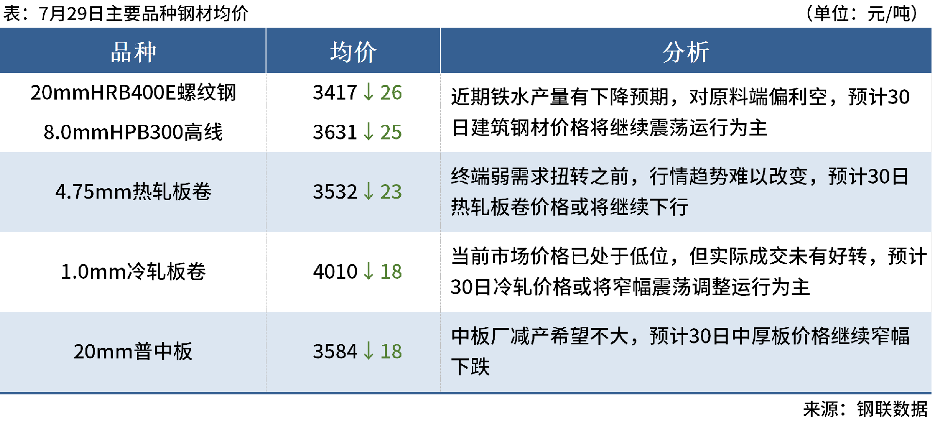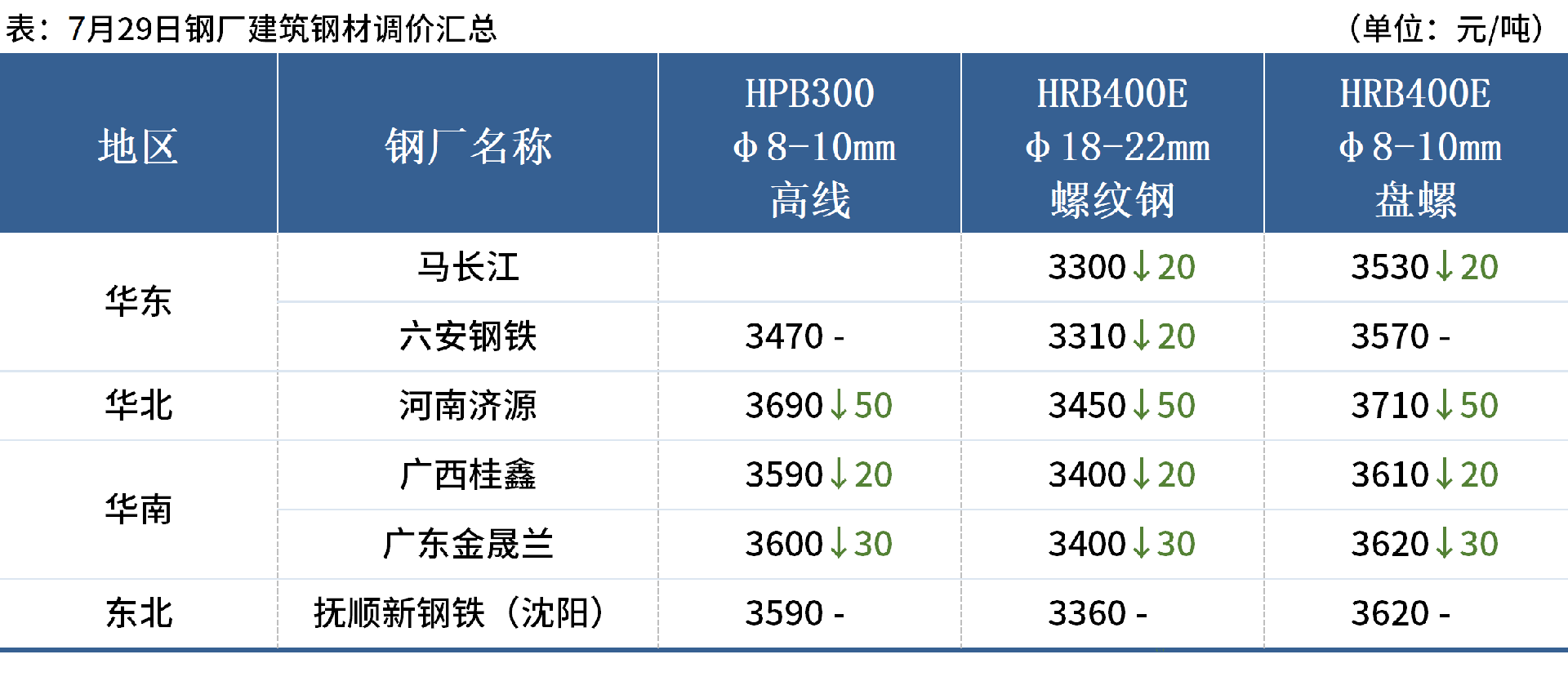◎據(jù)Mysteel不完全統(tǒng)計,截至7月29日,已有22家鋼企實施產(chǎn)銷調(diào)控,應對市場變動。初步測算,減產(chǎn)檢修共計影響建筑鋼材產(chǎn)量達219萬噸。詳情>>