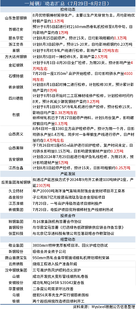 據(jù)Mysteel不完全統(tǒng)計(jì),本周(7月29日-8月2日)15家鋼廠發(fā)布檢修信息,具體如下: