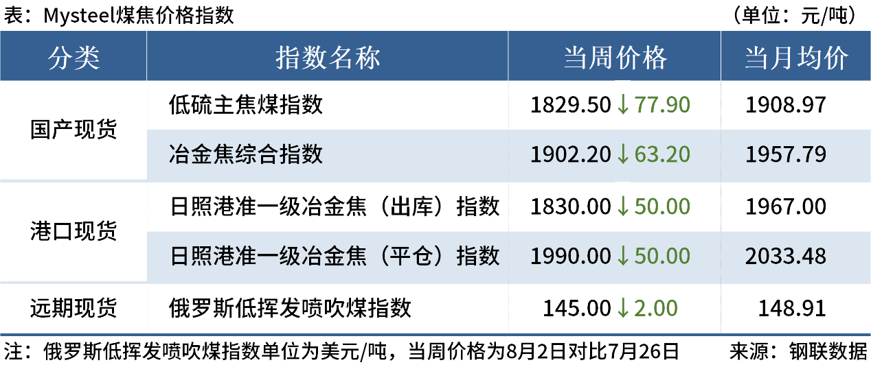 ◎8月2日,河北、山東等地區(qū)主流鋼廠對焦炭采購價格進行第二輪降價,濕熄焦降幅50元/噸,干熄焦降幅55元/噸。