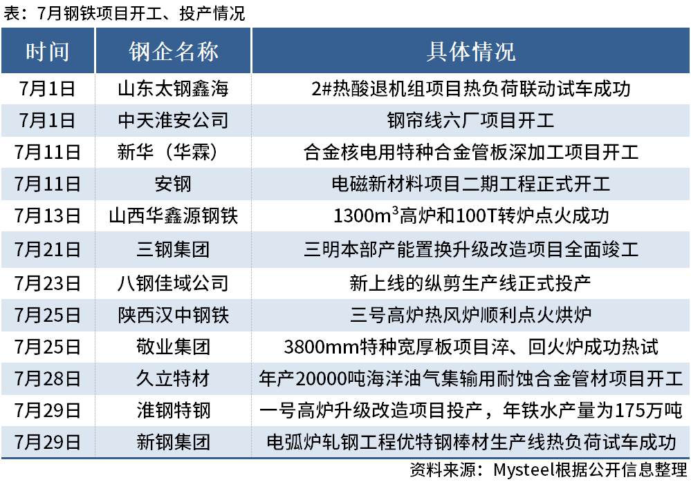 ◎據(jù)Mysteel不完全整理,2024年7月份有12個鋼鐵項目開工或投產(chǎn)。其中,中天淮安、安鋼等項目開工;淮鋼特鋼、八鋼等項目投產(chǎn)。