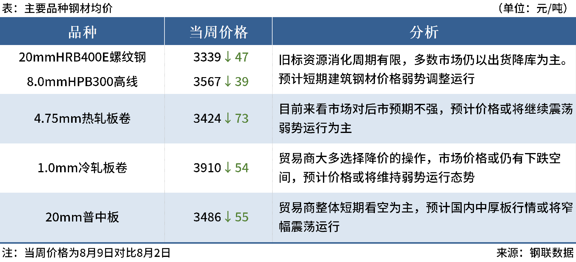 ◎8月11日,沙鋼出臺(tái)8月中旬出廠價(jià),螺紋鋼下調(diào)70元/噸,盤(pán)線下調(diào)100元/噸,現(xiàn)螺紋鋼3550元/噸、盤(pán)螺3560元/噸。
