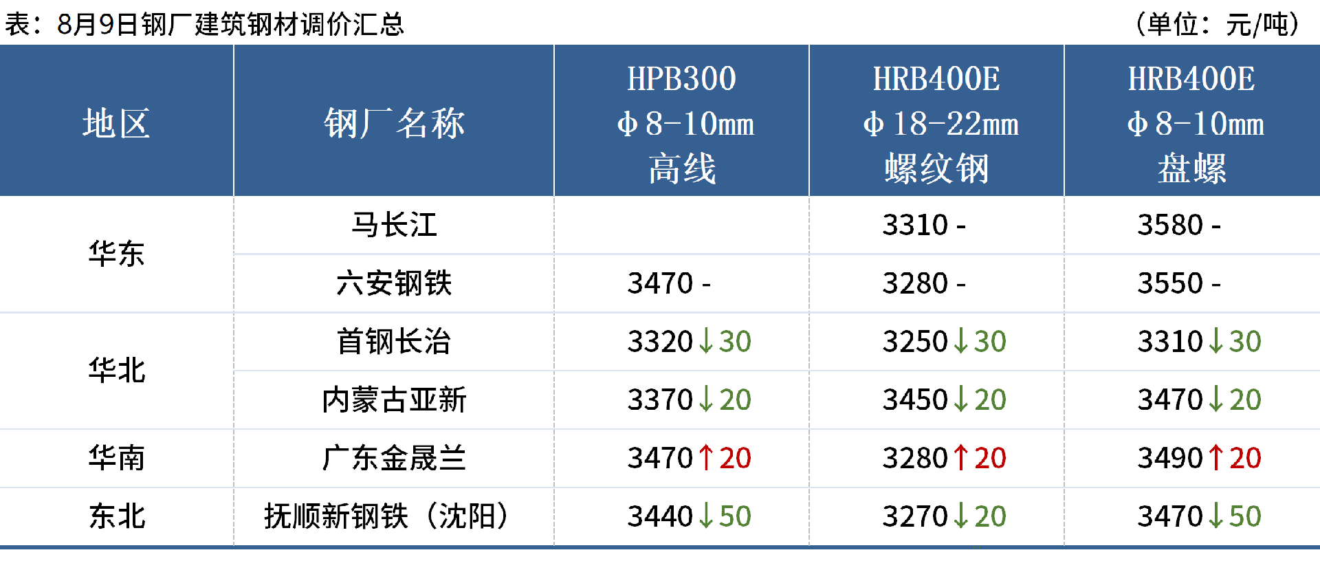 ◎8月10日,中天鋼鐵出臺(tái)8月中旬出廠價(jià),螺紋平、線材盤(pán)螺平,現(xiàn)華東螺紋3350元/噸、線材盤(pán)螺3700元/噸。