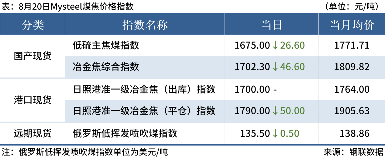 ◎ 8月20日,焦炭第五輪提降落地。河北、山東市場(chǎng)主流鋼廠對(duì)焦炭采購(gòu)價(jià)濕熄下調(diào)50元/噸,干熄下調(diào)55元/噸。