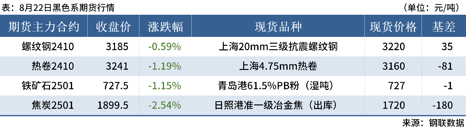 ◎ 8月22日,焦炭市場價格偏弱運行,河北、天津部分鋼廠提出焦炭第六輪降價,預(yù)計23日落地。