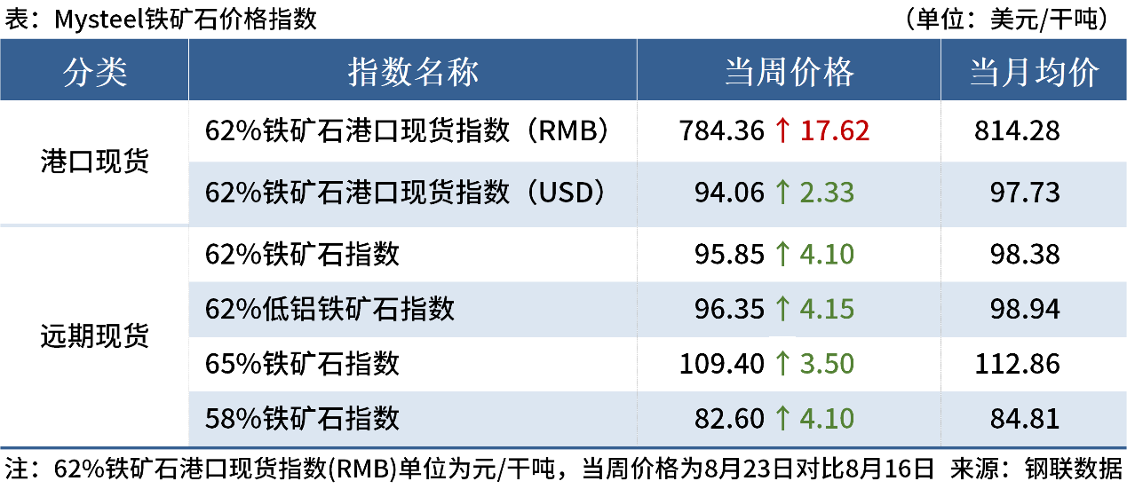 ◎上周,鐵礦石價(jià)格觸底反彈。Mysteel62%澳粉遠(yuǎn)期價(jià)格指數(shù)95.85美元/干噸,周環(huán)比上漲4.1美元/干噸,漲幅4.47%;青島港PB粉價(jià)格717元/噸,周環(huán)比上漲18元/噸,漲幅2.58%。詳情>>
