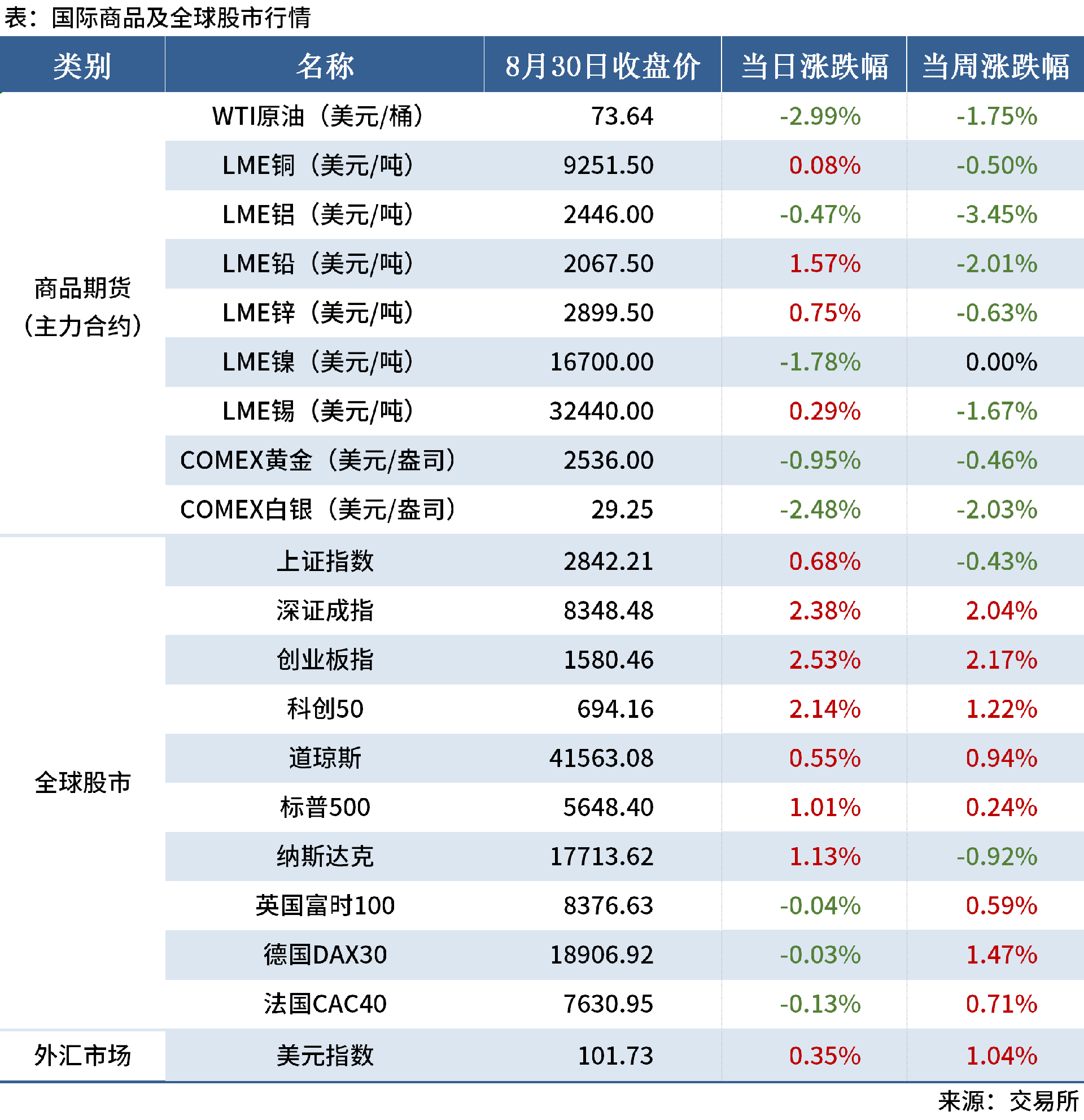 當(dāng)周,商品期貨方面,主要商品期貨價(jià)格多數(shù)下跌,鋁價(jià)格大幅下跌3.45%。全球股市方面,中國(guó)股市多數(shù)上漲,創(chuàng)業(yè)板指漲幅最大,達(dá)2.17%;歐美股市漲跌互現(xiàn),其中,德國(guó)DAX30漲幅最高,達(dá)1.47%。外匯市場(chǎng)方面,美元指數(shù)收于101.73,上漲1.04%。