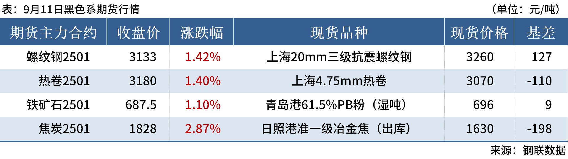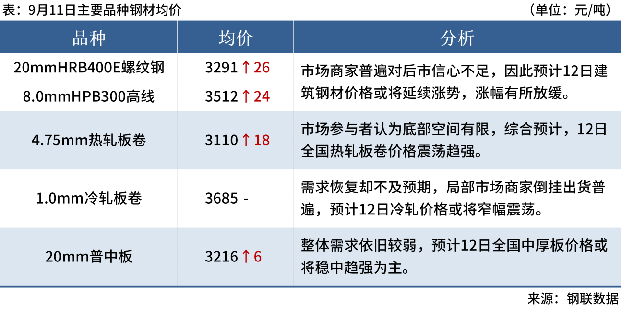 ◎ 9月11日,全國主港鐵礦石成交104.00萬噸,環(huán)比增28.6%;237家主流貿(mào)易商建筑鋼材成交12.41萬噸,環(huán)比增5%。