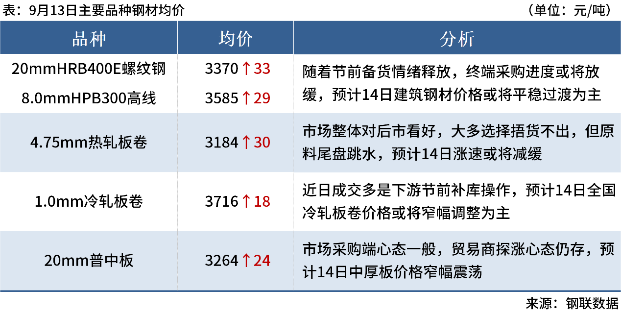 ◎9月13日,河北、山西等主流焦企開啟首輪提漲,濕熄焦上調(diào)50元/噸、干熄焦上調(diào)55元/噸。