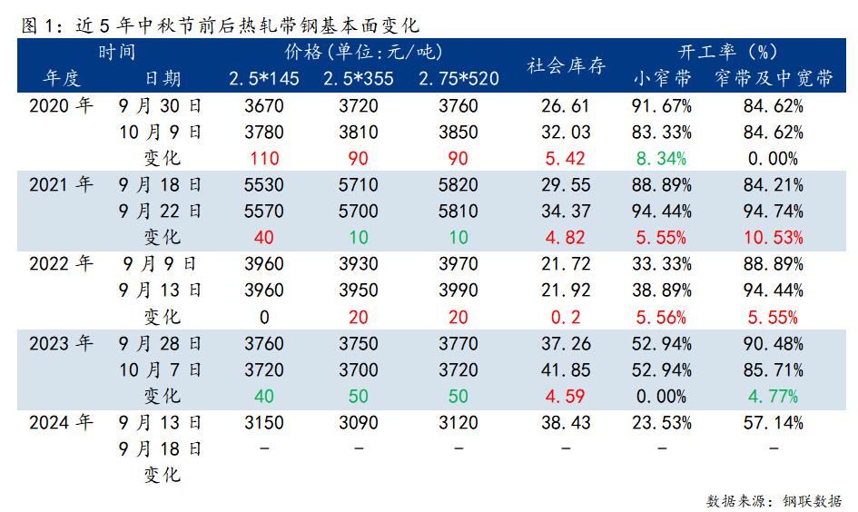 ◎Mysteel整理了近5年中秋節(jié)前后唐山市場熱軋帶鋼基本面數(shù)據(jù)變化,具體如下: