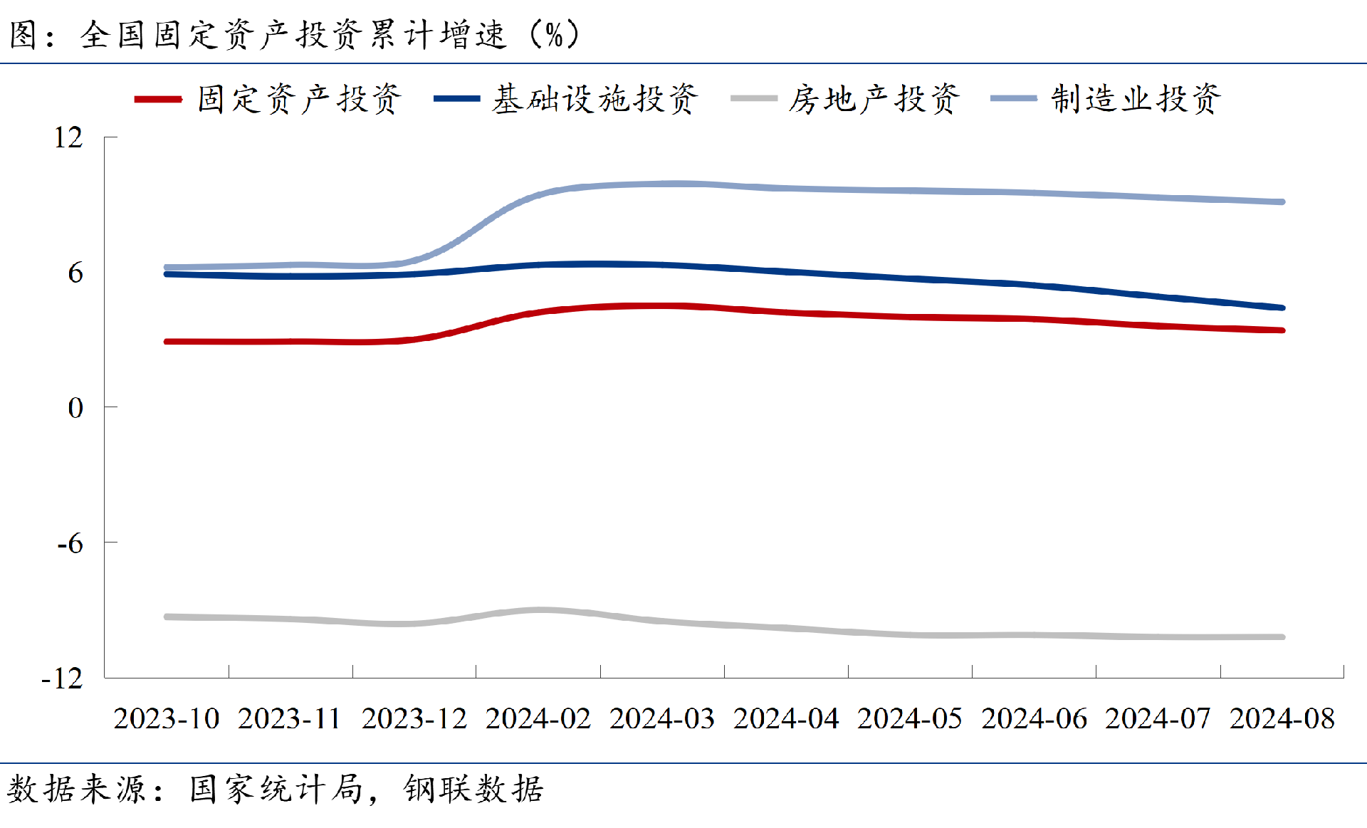 ◎ 國家統(tǒng)計(jì)局?jǐn)?shù)據(jù)顯示,1-8月,全國固定資產(chǎn)投資同比上漲3.4%,漲幅較前7月回落0.2個百分點(diǎn)。其中,基礎(chǔ)設(shè)施投資(不含電力投資)同比增長4.4%,增速較前7月放緩0.5個百分點(diǎn),連續(xù)五個月放緩;全國房地產(chǎn)開發(fā)投資同比下滑10.2%,降幅和前7個月持平;制造業(yè)投資同比增長9.1%,增速比前7個月回落0.2個百分點(diǎn),但仍處于較高水平。