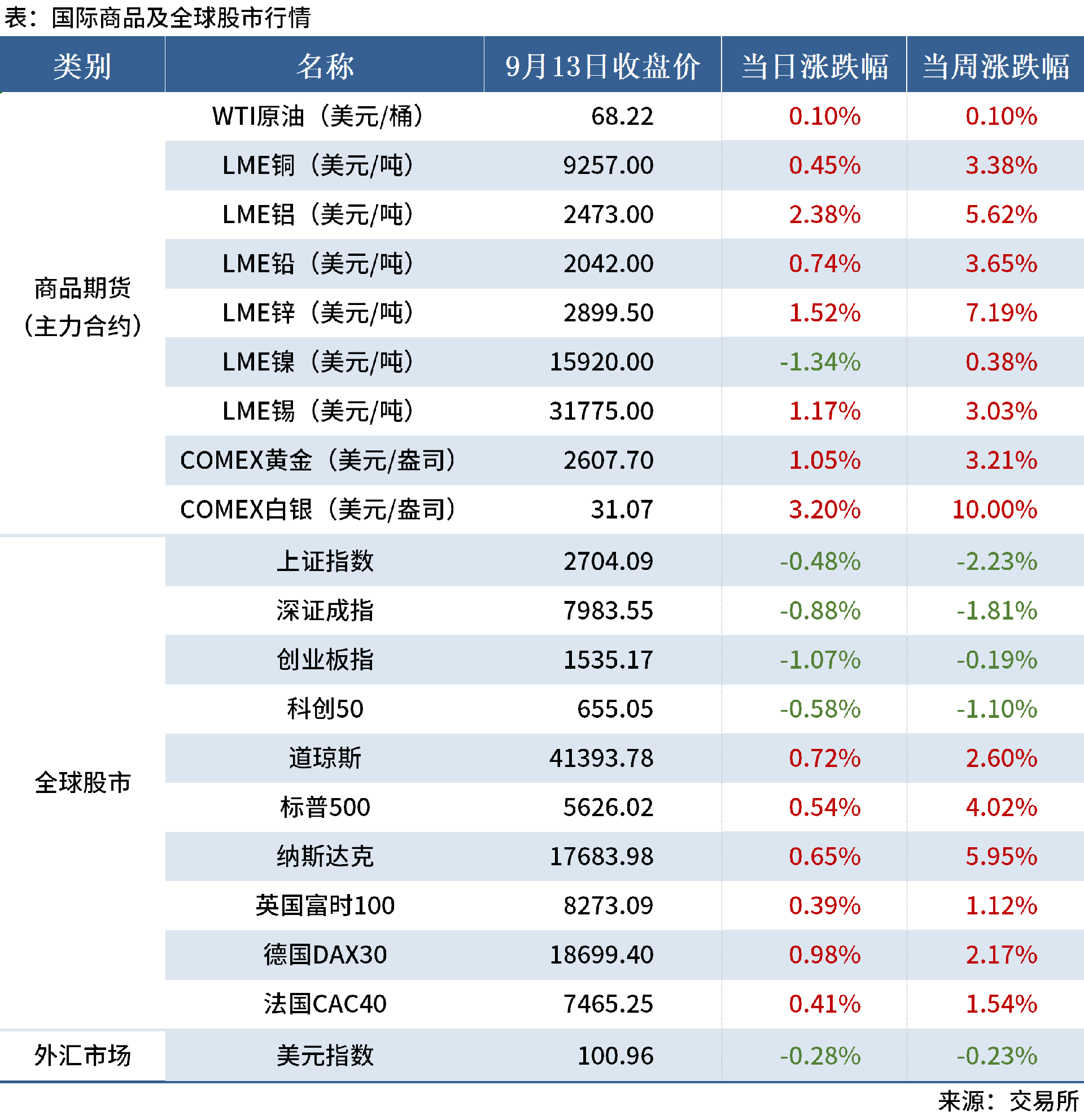 金融市場:本周主要商品期貨價格全部上漲,其中,白銀價格漲幅最高,達(dá)10%。全球股市中,中國股市全部下跌,上證指數(shù)跌幅最大,達(dá)2.23%;歐美股市全部上漲。美元指數(shù)收于100.96,下跌0.23%。