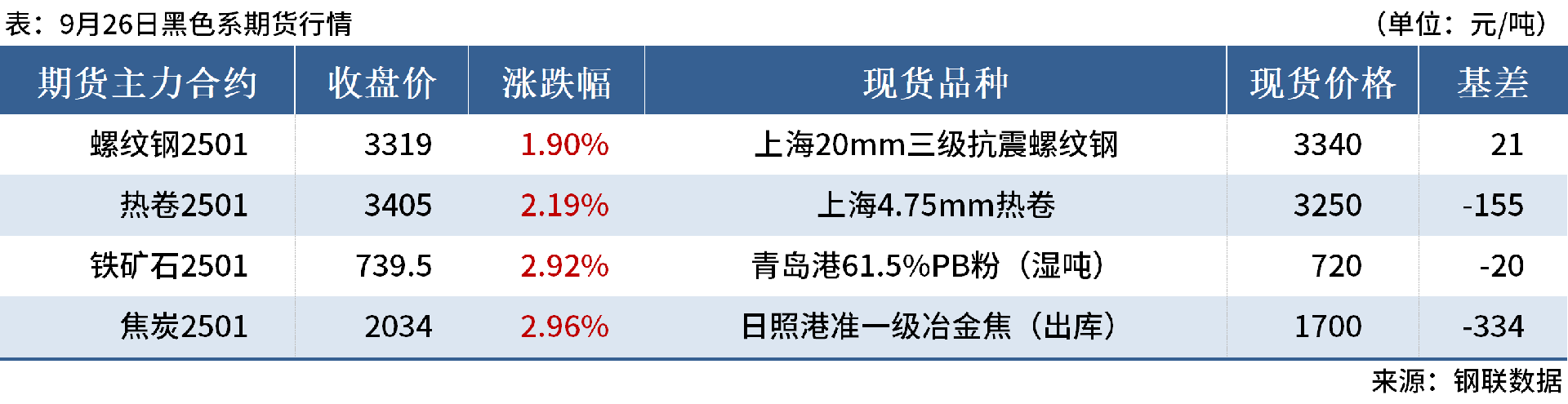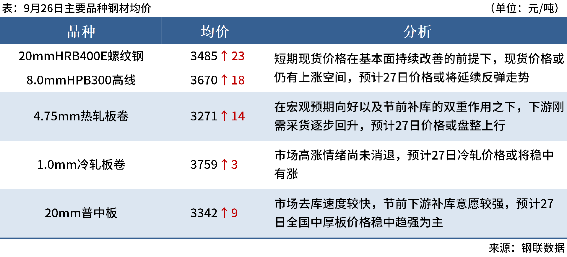 ◎9月26日,全國主港鐵礦石成交108.20萬噸,環(huán)比增7%;237家主流貿(mào)易商建筑鋼材成交14.59萬噸,環(huán)比增14.5%。