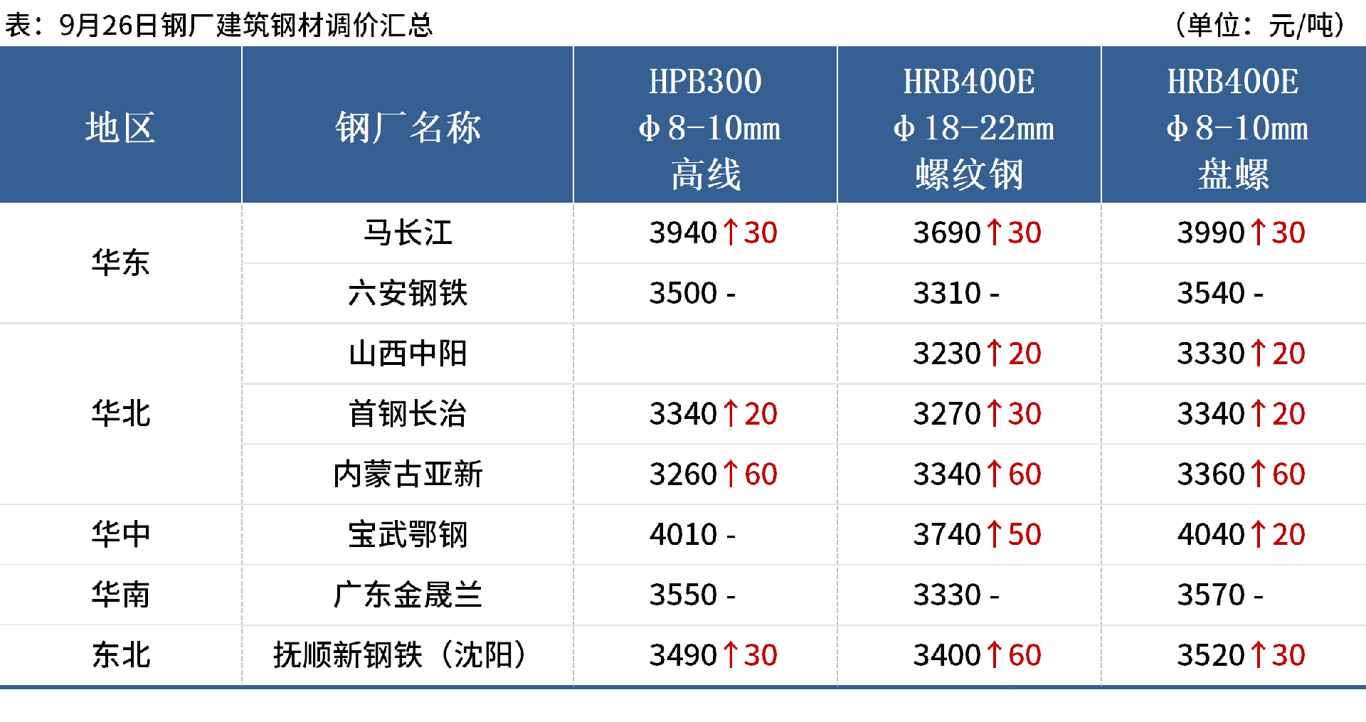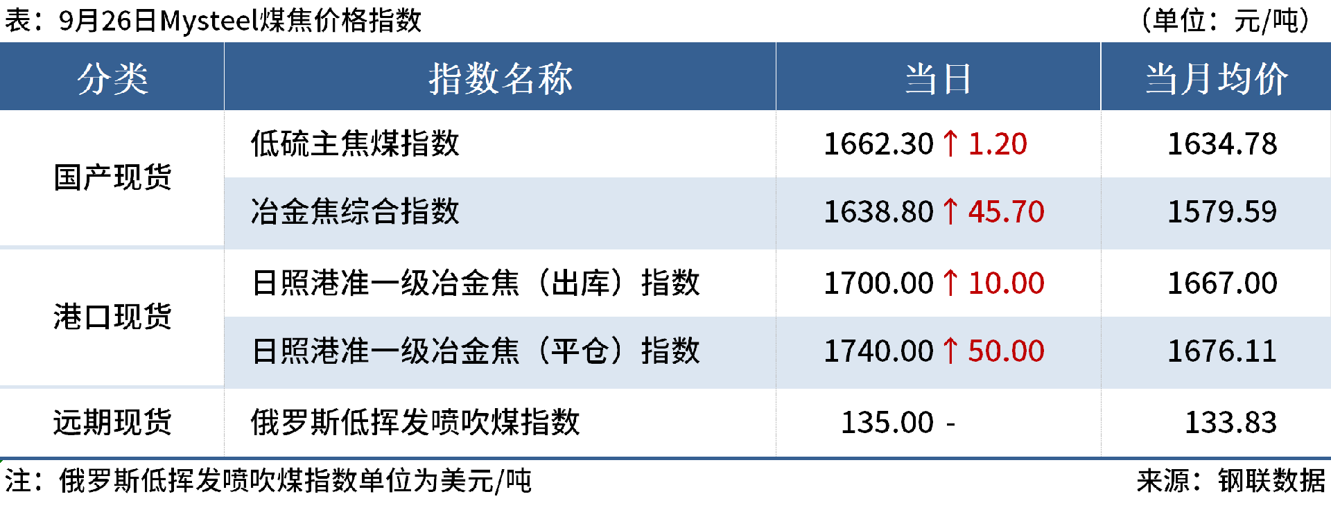 ◎9月26日,河北、山東等地區(qū)主流鋼廠對焦炭采購價格進行第二輪漲價,濕熄焦上調(diào)50元/噸,干熄焦上調(diào)55元/噸,至此焦炭第二輪漲價全面落地。