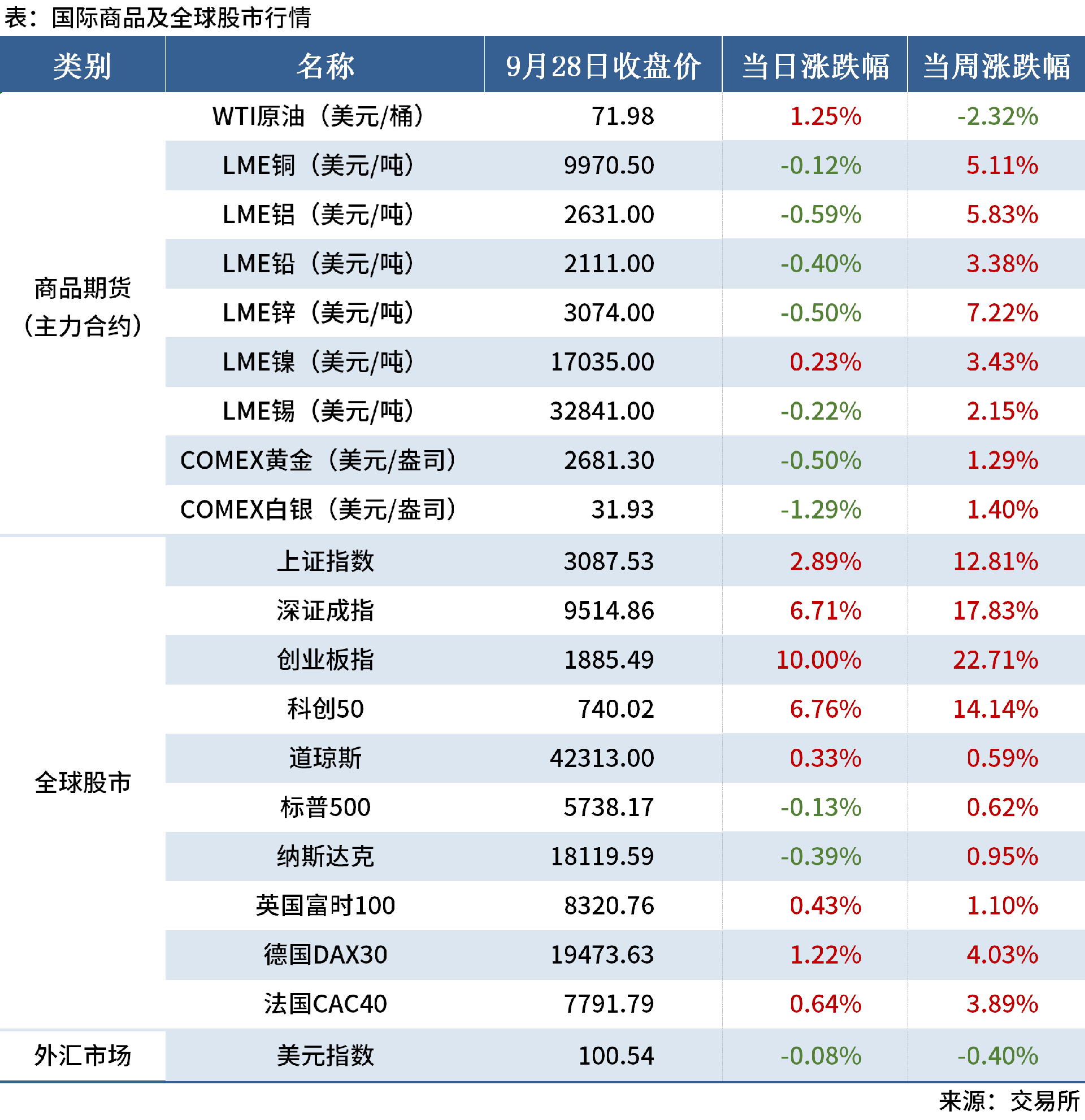 當(dāng)周,商品期貨方面,主要商品期貨價(jià)格多數(shù)上漲,其中,鋅價(jià)格漲幅最高,達(dá)7.22%。全球股市方面,中國(guó)股市大幅上漲,創(chuàng)業(yè)板指漲幅最大,達(dá)22.71%;歐美股市全部上漲,其中,德國(guó)DAX30漲幅最高,達(dá)4.03%。外匯市場(chǎng)方面,美元指數(shù)收于100.54,下跌0.40%。