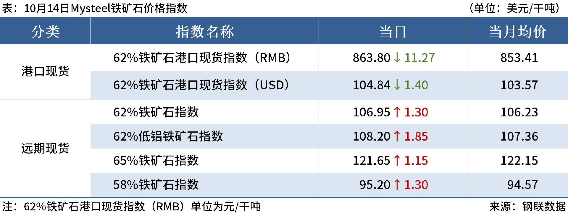 ◎10月14日,中國47港鐵礦石到港總量3042.6萬噸,環(huán)比增加942.6萬噸;中國45港鐵礦石到港總量2948.8萬噸,環(huán)比增加990.1萬噸。