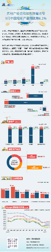1-9月,房地產(chǎn)開發(fā)投資、商品房銷售面積同比分別下降10.1%和17.1%,降幅較1-8月收窄;制造業(yè)投資同比增長9.2%,增速回升0.1個百分點;基建投資同比增長4.1%,增速回落0.3個百分點。9月中國粗鋼產(chǎn)量7707萬噸,同比下降6.1%。