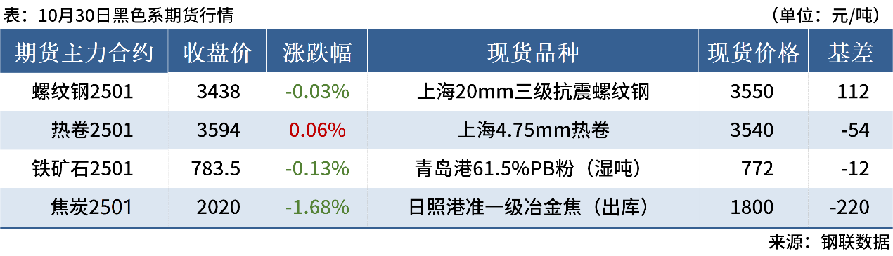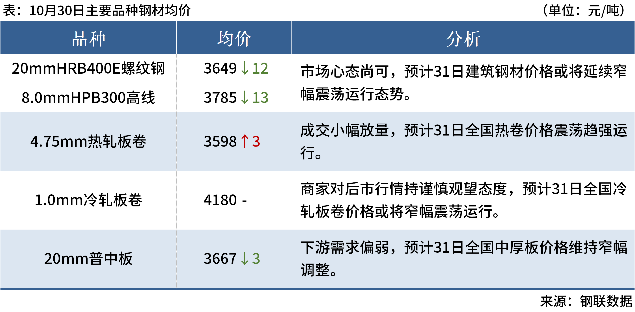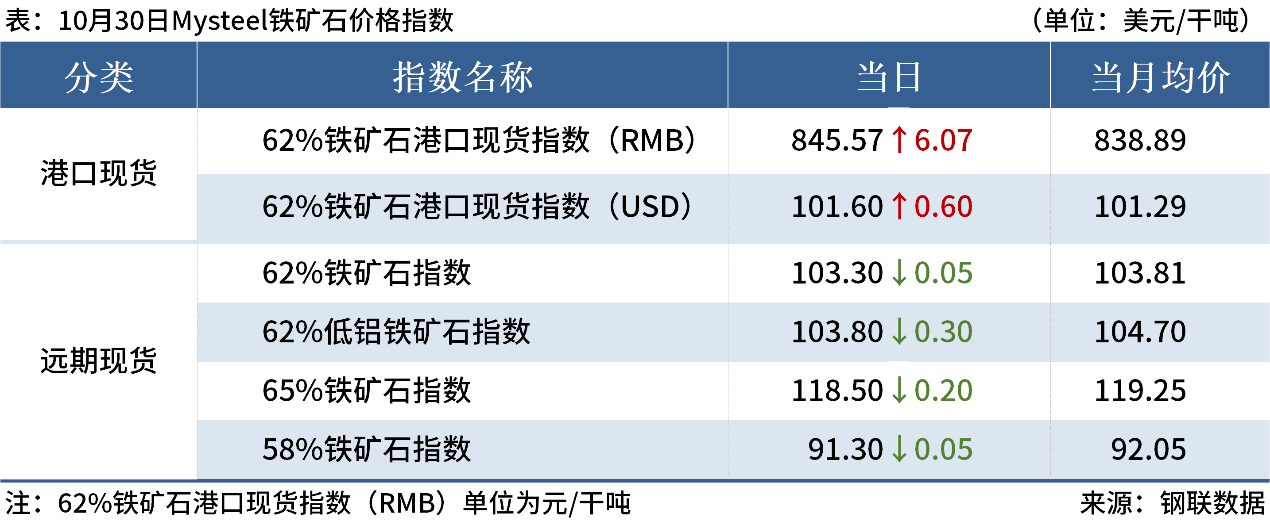 ◎10月30日,全國(guó)主港鐵礦石成交133.24萬噸,環(huán)比增20.9%;237家主流貿(mào)易商建筑鋼材成交11.72萬噸,環(huán)比增8.3%。