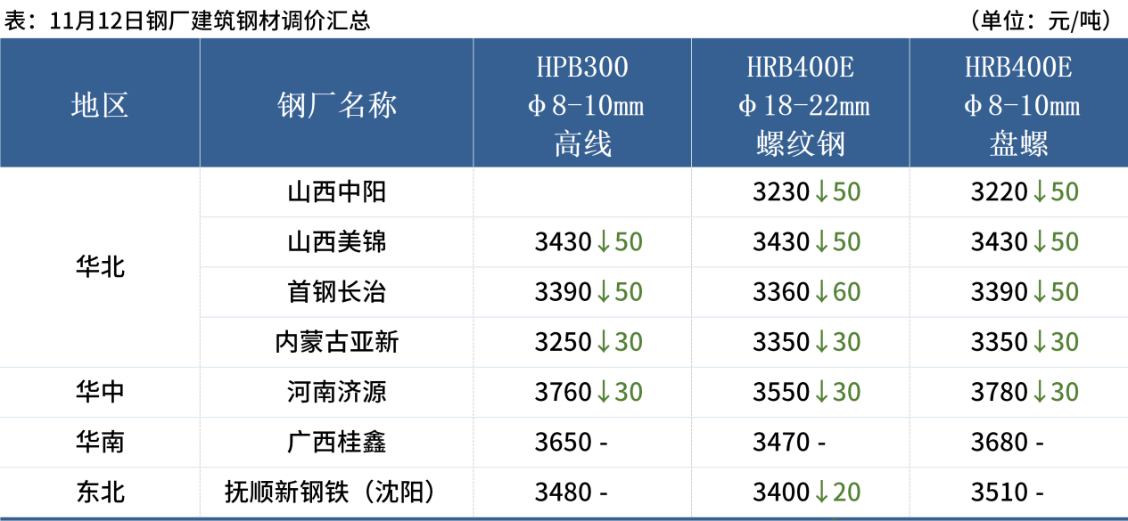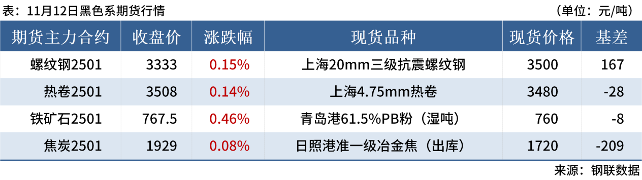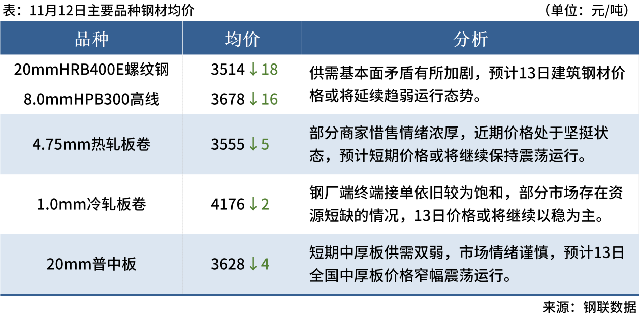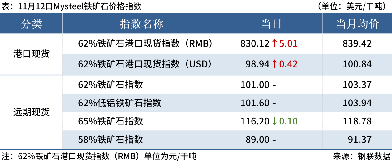 ◎ 11月12日,全國主港鐵礦石成交128.18萬噸,環(huán)比增13.2%;237家主流貿(mào)易商建筑鋼材成交13.08萬噸,環(huán)比增16.2%。