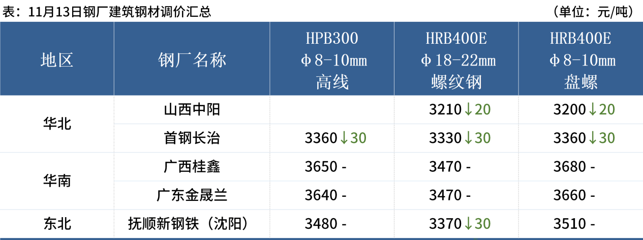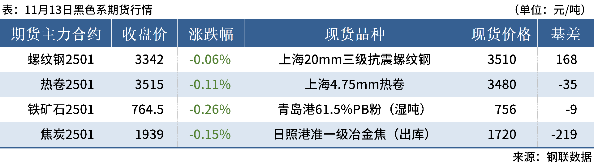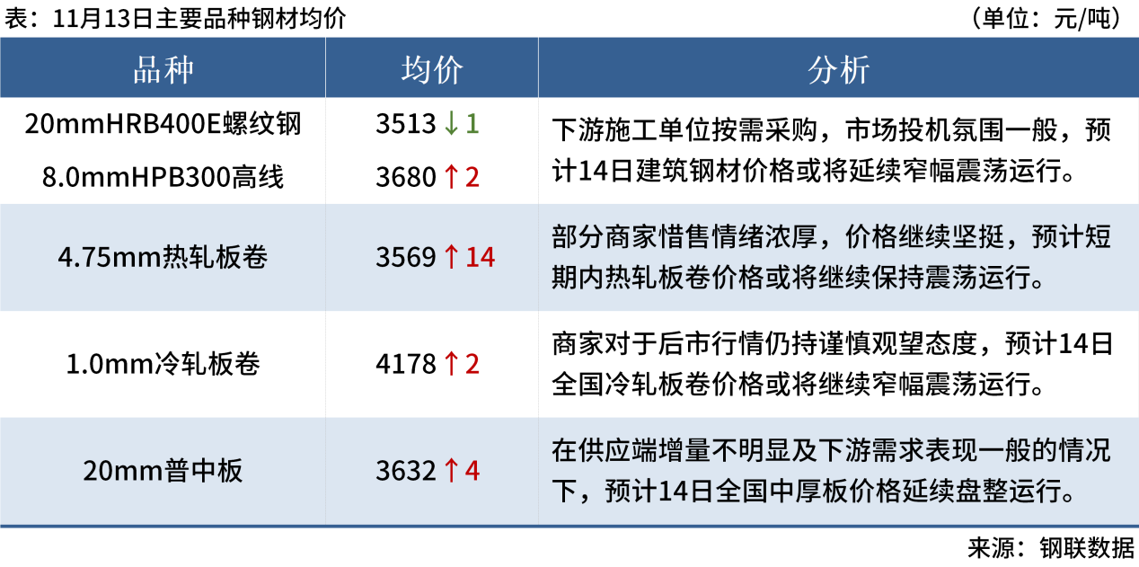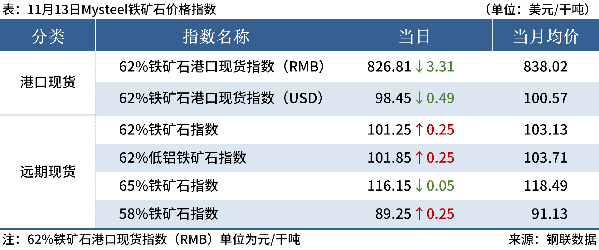◎ 11月13日,全國主港鐵礦石成交103.06萬噸,環(huán)比減19.6%;237家主流貿(mào)易商建筑鋼材成交12.32萬噸,環(huán)比減5.8%。