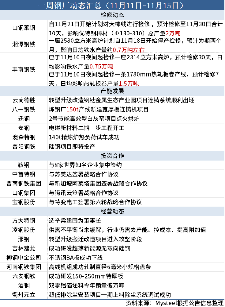據(jù)Mysteel不完全統(tǒng)計,本周(11月11日-11月15日)3家鋼廠發(fā)布檢修信息,具體如下: