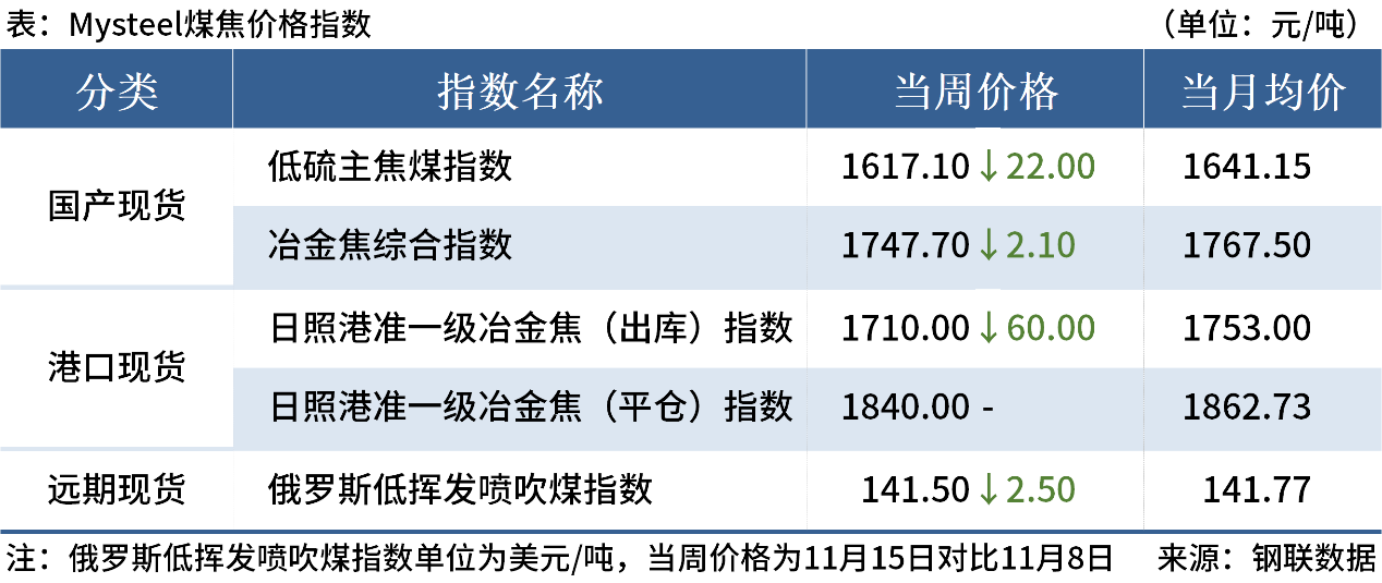 ◎11月15日,河北、天津等地區(qū)部分鋼廠對(duì)焦炭采購價(jià)進(jìn)行第三輪下調(diào),濕熄焦下調(diào)50元/噸,干熄焦下調(diào)55元/噸,預(yù)計(jì)焦炭第三輪降價(jià)將于11月18日全面落地。詳情>>