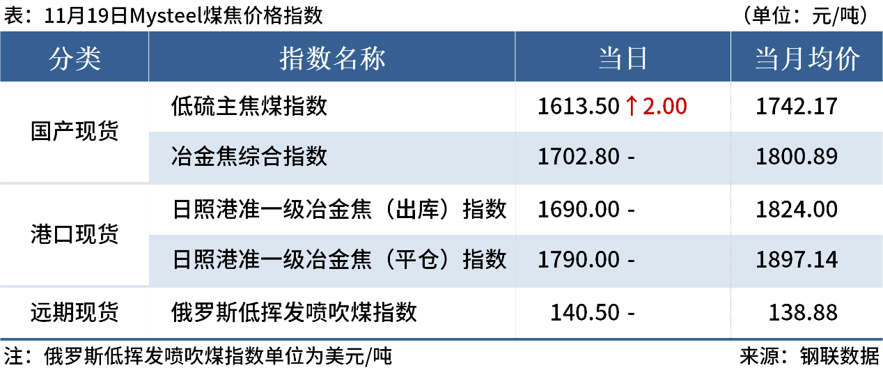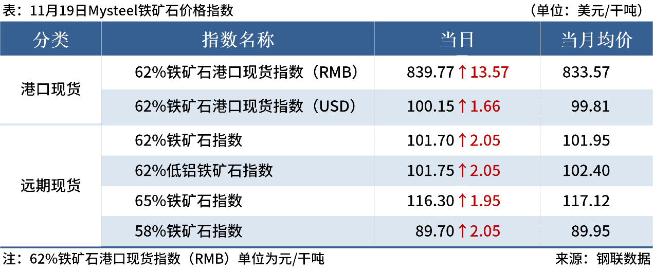 ◎11月19日,Mysteel 62%鐵礦石指數(shù)101.7,漲2.05,月均101.95;65%鐵礦石指數(shù)116.3,漲1.95,月均117.12。(單位:美元/干噸)