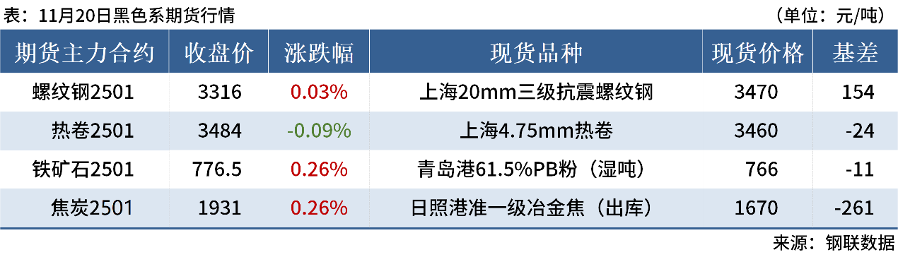 ◎11月20日,全國主港鐵礦石成交89.54萬噸,環(huán)比減21.5%;237家主流貿易商建筑鋼材成交9.93萬噸,環(huán)比減26.5%。