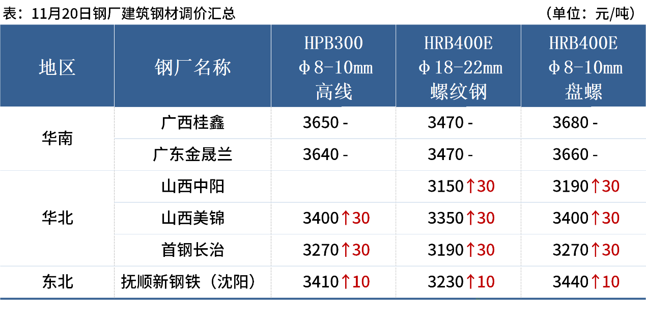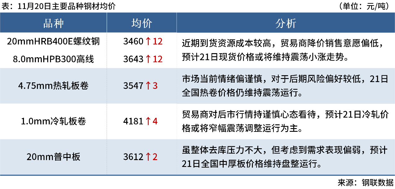 ◎11月20日,唐山遷安普方坯資源出廠含稅上調10元/噸,報3090元/噸。