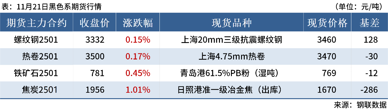 ◎11月21日,全國主港鐵礦石成交124.61萬噸,環(huán)比增39.2%;237家主流貿(mào)易商建筑鋼材成交11.36萬噸,環(huán)比增14.4%。