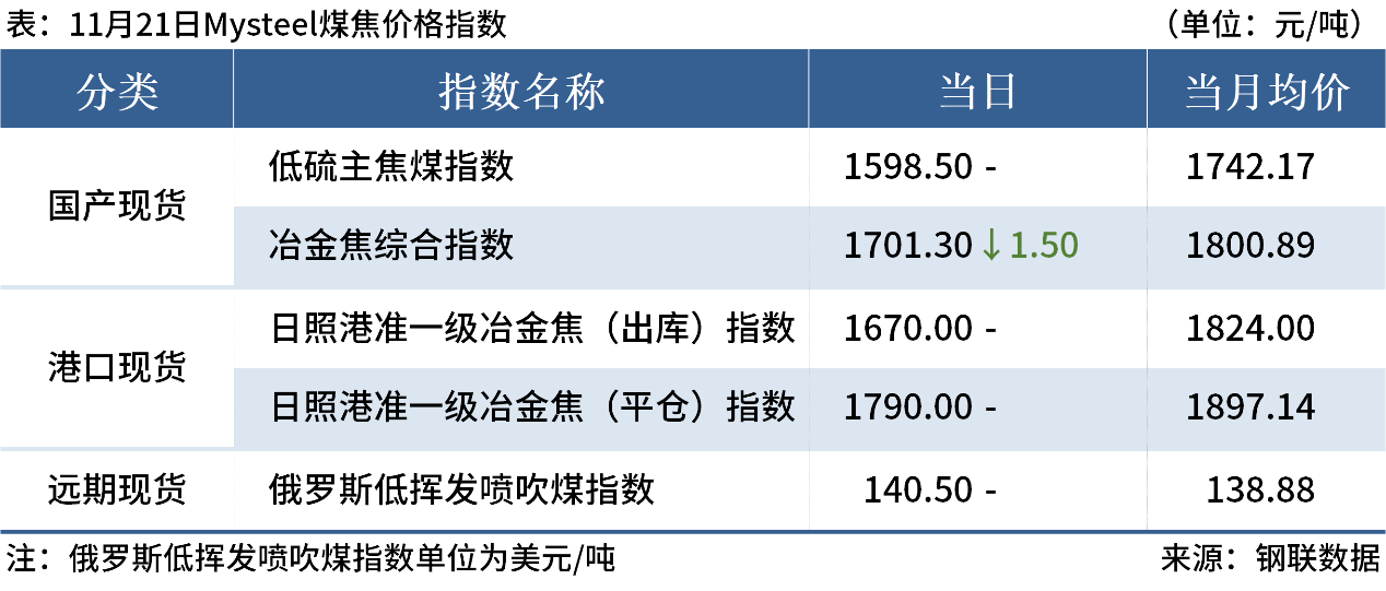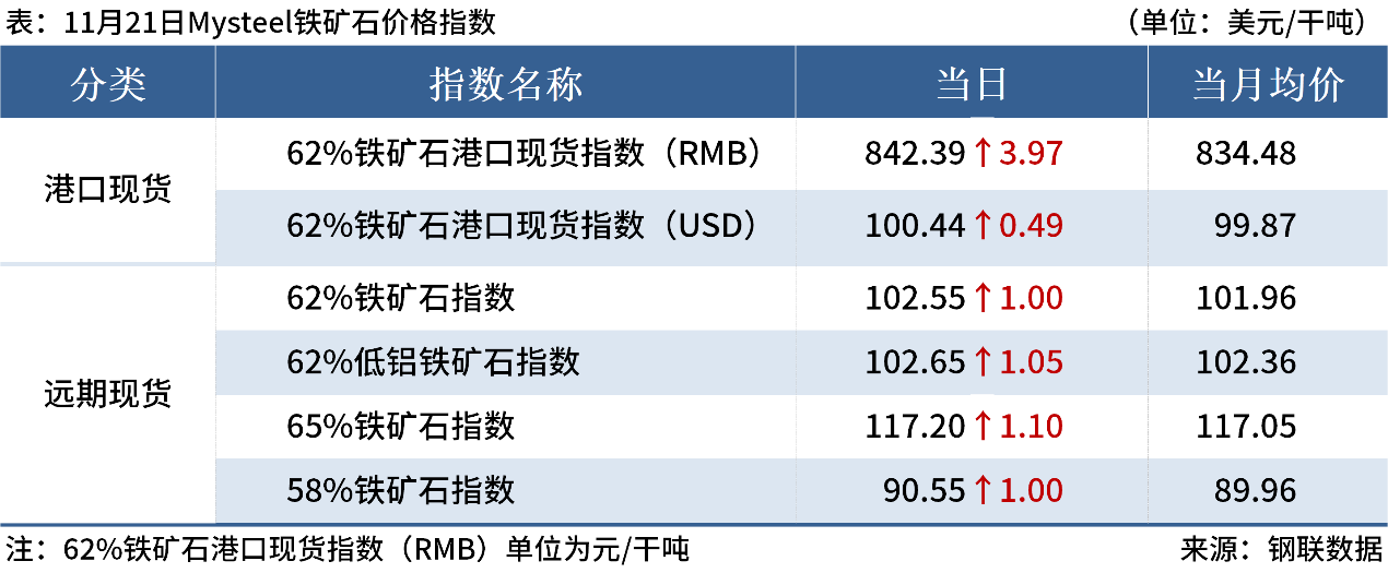◎11月21日,Mysteel62%鐵礦石指數(shù)102.55,漲1,月均101.96;65%鐵礦石指數(shù)117.2,漲1.1,月均117.05。(單位:美元/干噸)