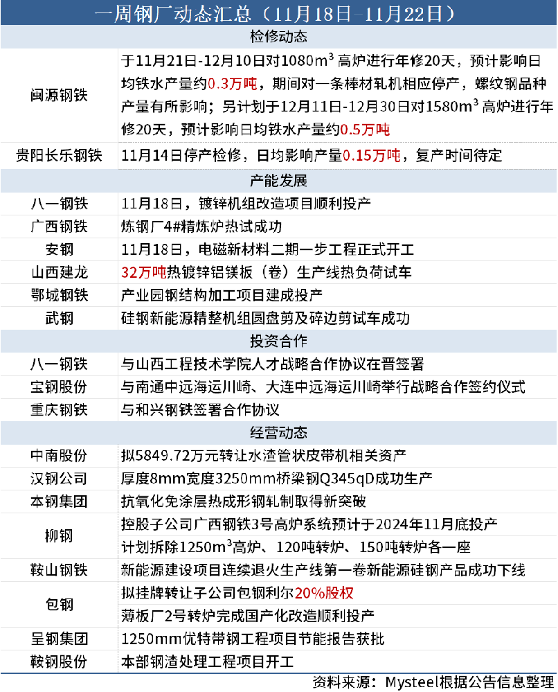 據(jù)Mysteel不完全統(tǒng)計(jì),本周(11月18日-11月22日)2家鋼廠發(fā)布檢修信息,具體如下: