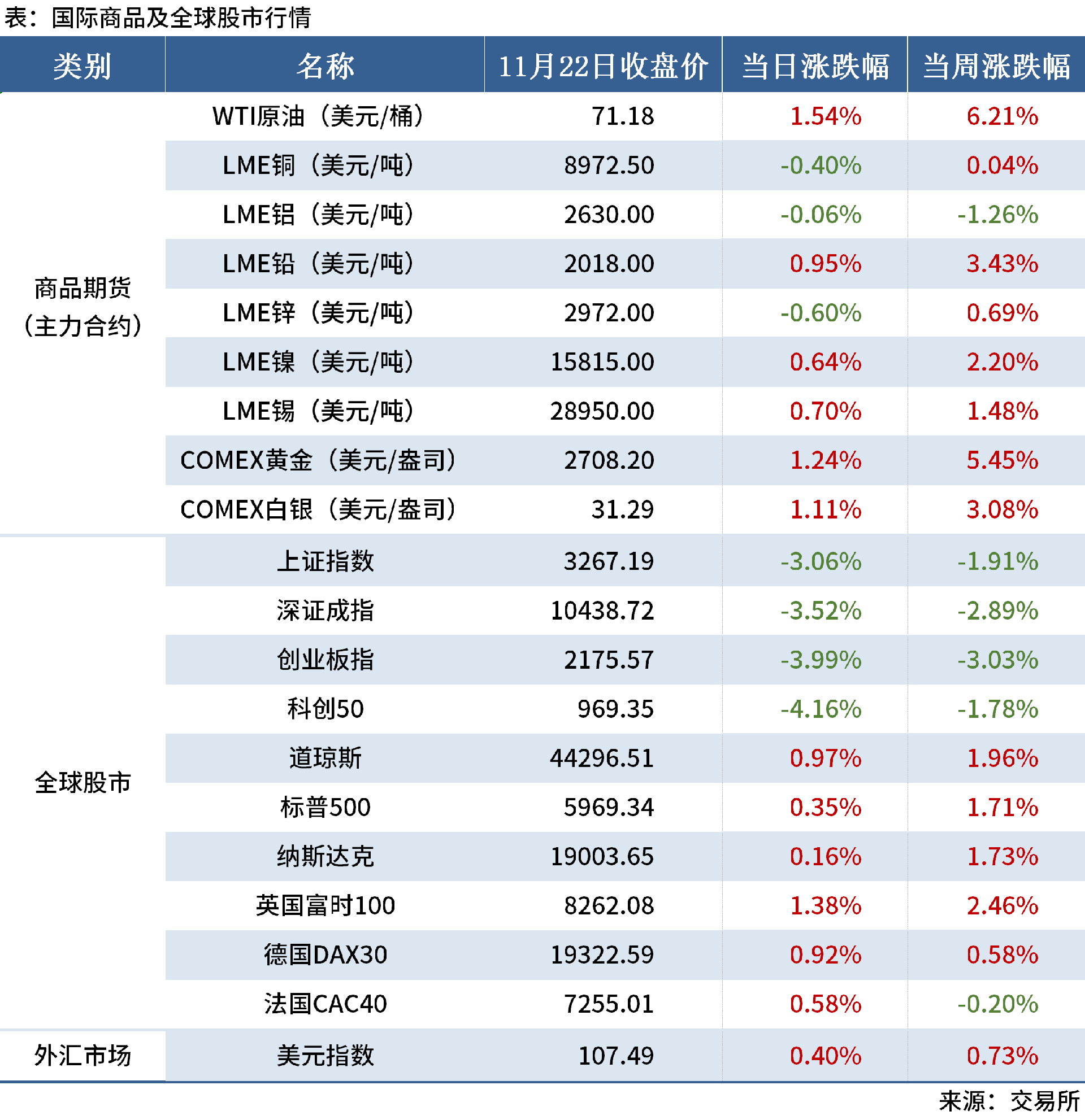 當(dāng)周,商品期貨方面,主要商品期貨價格多數(shù)上漲,原油價格大幅上漲6.21%。全球股市方面,中國股市全部下跌;歐美股市多數(shù)上漲,其中,法國CAC40小幅下跌0.20%。外匯市場方面,美元指數(shù)收于107.49,上漲0.73%。