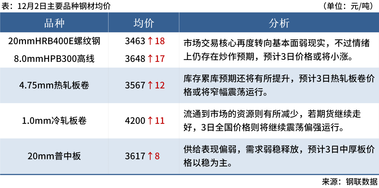 ◎ 12月2日,全國主港鐵礦石成交103.85萬噸,環(huán)比減5%;237家主流貿(mào)易商建筑鋼材成交13.71萬噸,環(huán)比增4.6%。
