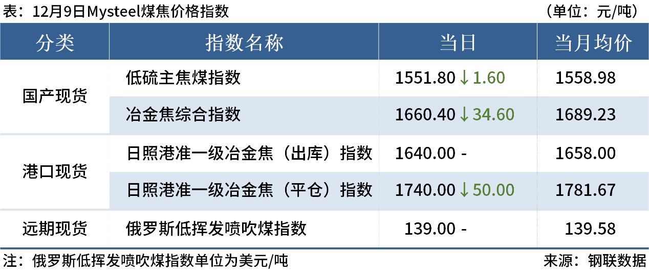 ◎12月9日,焦炭第四輪提降落地。河北、山東市場(chǎng)鋼廠對(duì)焦炭采購(gòu)價(jià)下調(diào),濕熄降幅50元/噸,干熄降幅55元/噸。