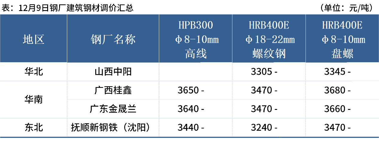 ◎因環(huán)保限產(chǎn),河北金鼎重工、河北文安鋼鐵、新興鑄管股份有限公司于12月9日分別停產(chǎn)檢修一座1080m3高爐、1080m3高爐、308m3高爐,影響鐵水產(chǎn)量共計(jì)0.75萬(wàn)噸/日。