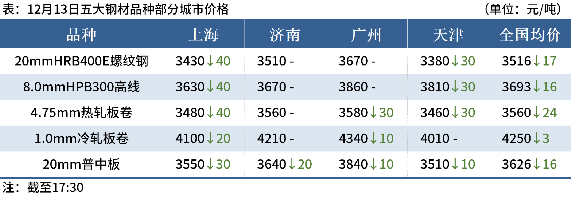 ◎12月13日,唐山遷安普方坯資源出廠含稅累計下調(diào)40,報3100元/噸。