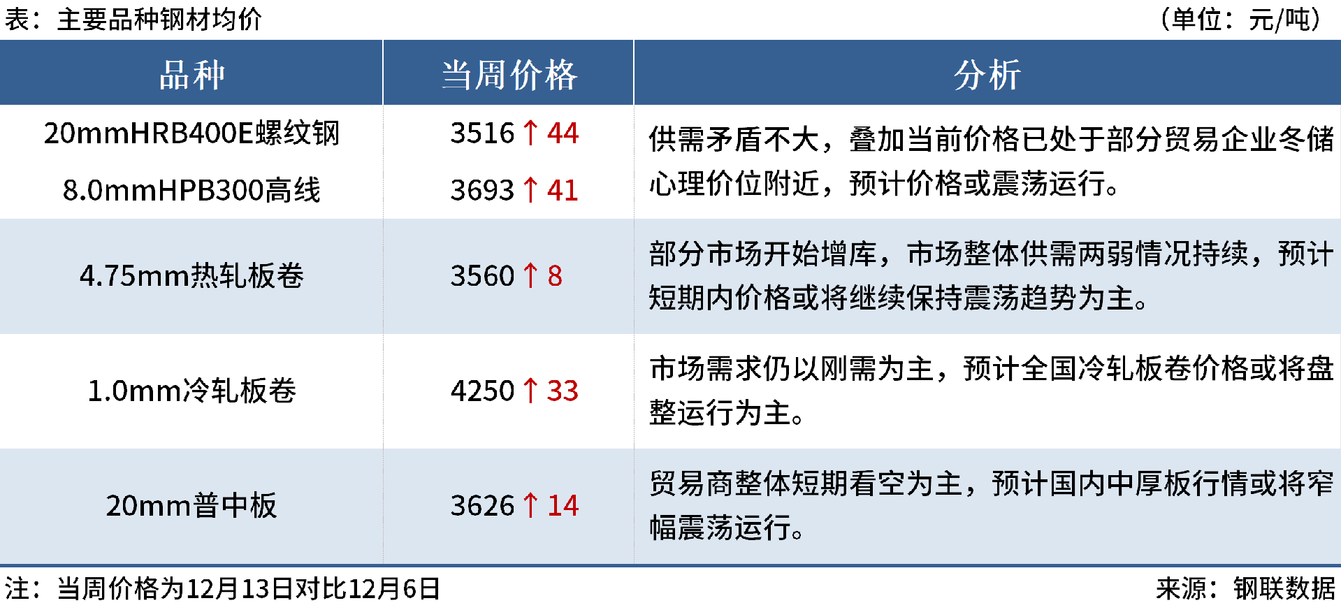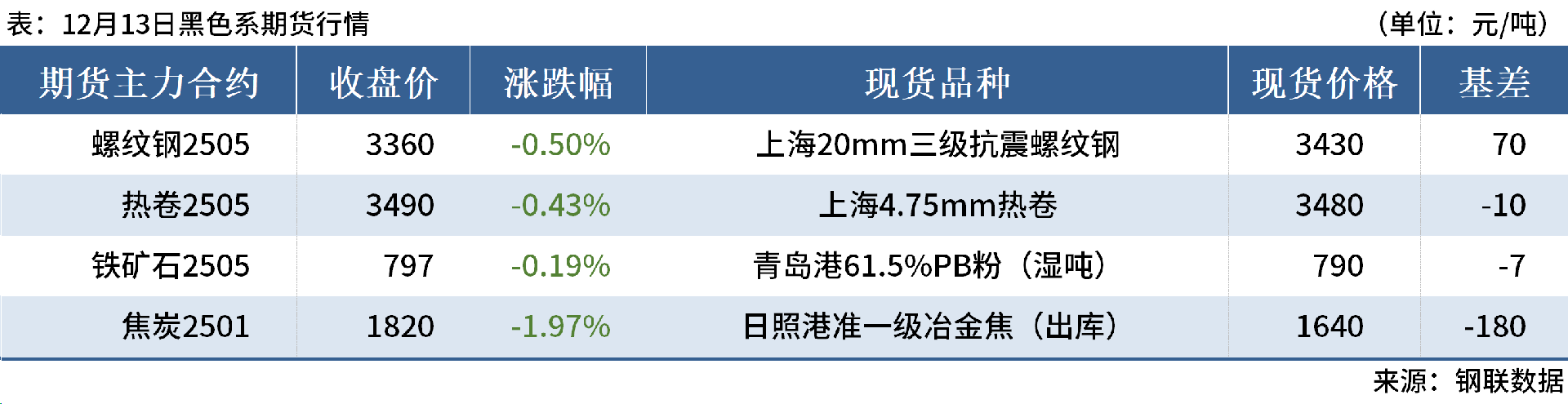 ◎12月13日,全國主港鐵礦石成交88.40萬噸,環(huán)比減13.9%;237家主流貿(mào)易商建筑鋼材成交10.32萬噸,環(huán)比減16.2%。