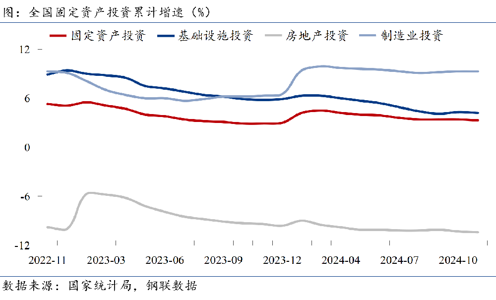 ◎ 1-11月,全國固定資產(chǎn)投資同比增長3.3%。其中,全國基礎(chǔ)設(shè)施投資同比增長4.2%;全國制造業(yè)投資同比增長9.3%;全國房地產(chǎn)開發(fā)投資93634億元,同比下降10.4%;新建商品房銷售面積86118萬平方米,同比下降14.3%,降幅比1-10月份收窄1.5個(gè)百分點(diǎn)。
