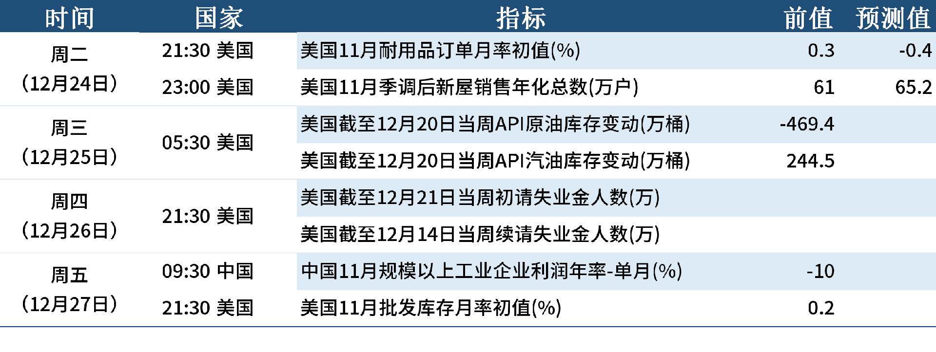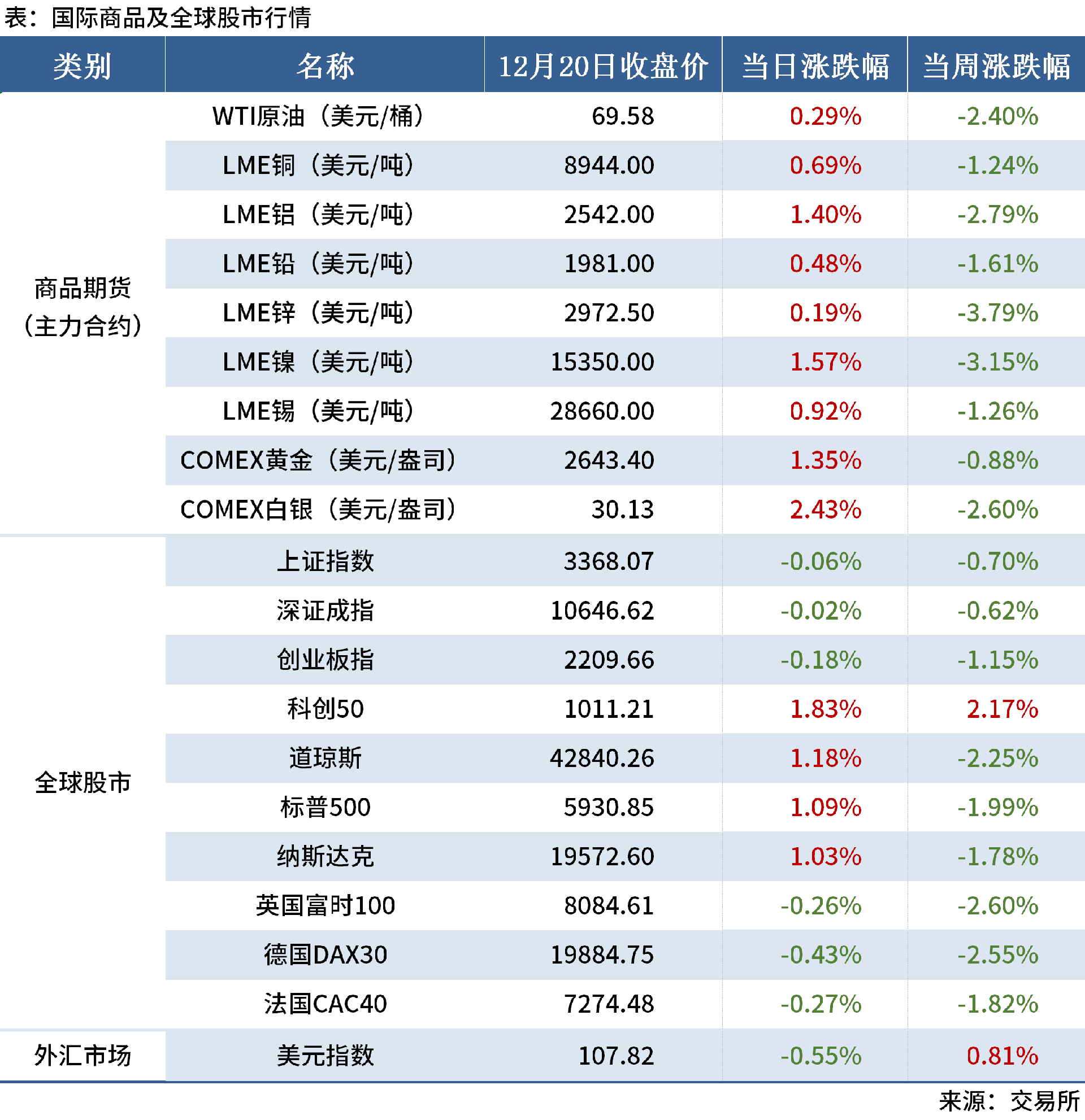 宏觀資訊:十四屆全國人大常委會(huì)第十三次會(huì)議于12月21日至25日在北京舉行;工信部等四部門發(fā)文推動(dòng)原材料工業(yè)優(yōu)化升級(jí);11月中國經(jīng)濟(jì)數(shù)據(jù)延續(xù)回升態(tài)勢(shì);中美金融工作組舉行第七次會(huì)議;美聯(lián)儲(chǔ)降息25個(gè)基點(diǎn)并釋放謹(jǐn)慎信號(hào)。