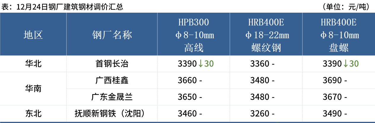 ◎ 12月24日,全國主港鐵礦石成交94.60萬噸,環(huán)比增1.4%;237家主流貿(mào)易商建筑鋼材成交11.89萬噸,環(huán)比減4.4%。