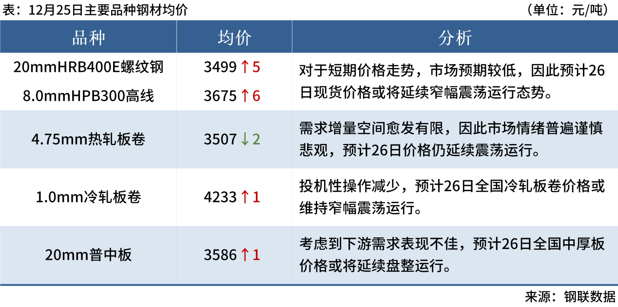 ◎ 12月25日,全國主港鐵礦石成交88.78萬噸,環(huán)比減6.2%;237家主流貿易商建筑鋼材成交9.81萬噸,環(huán)比減17.5%。