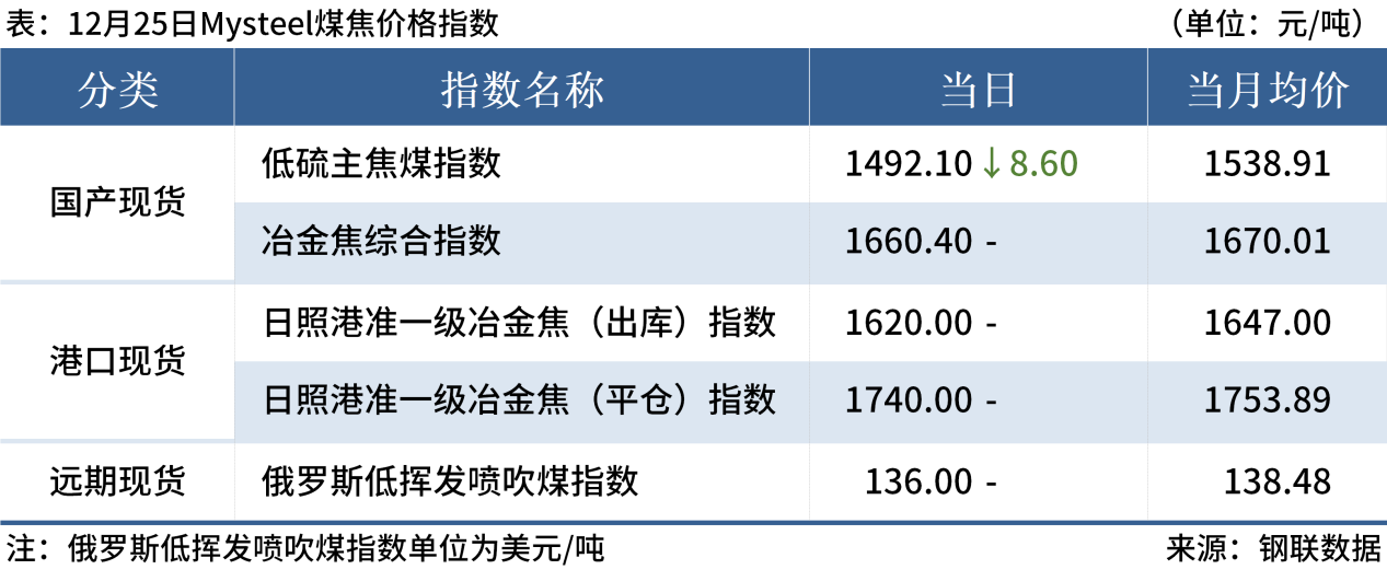 ◎ 焦炭開啟第五輪提降。河北、天津部分鋼廠對濕熄焦炭下調50元/噸、干熄焦炭下調55元/噸,2024年12月27日零點執(zhí)行。